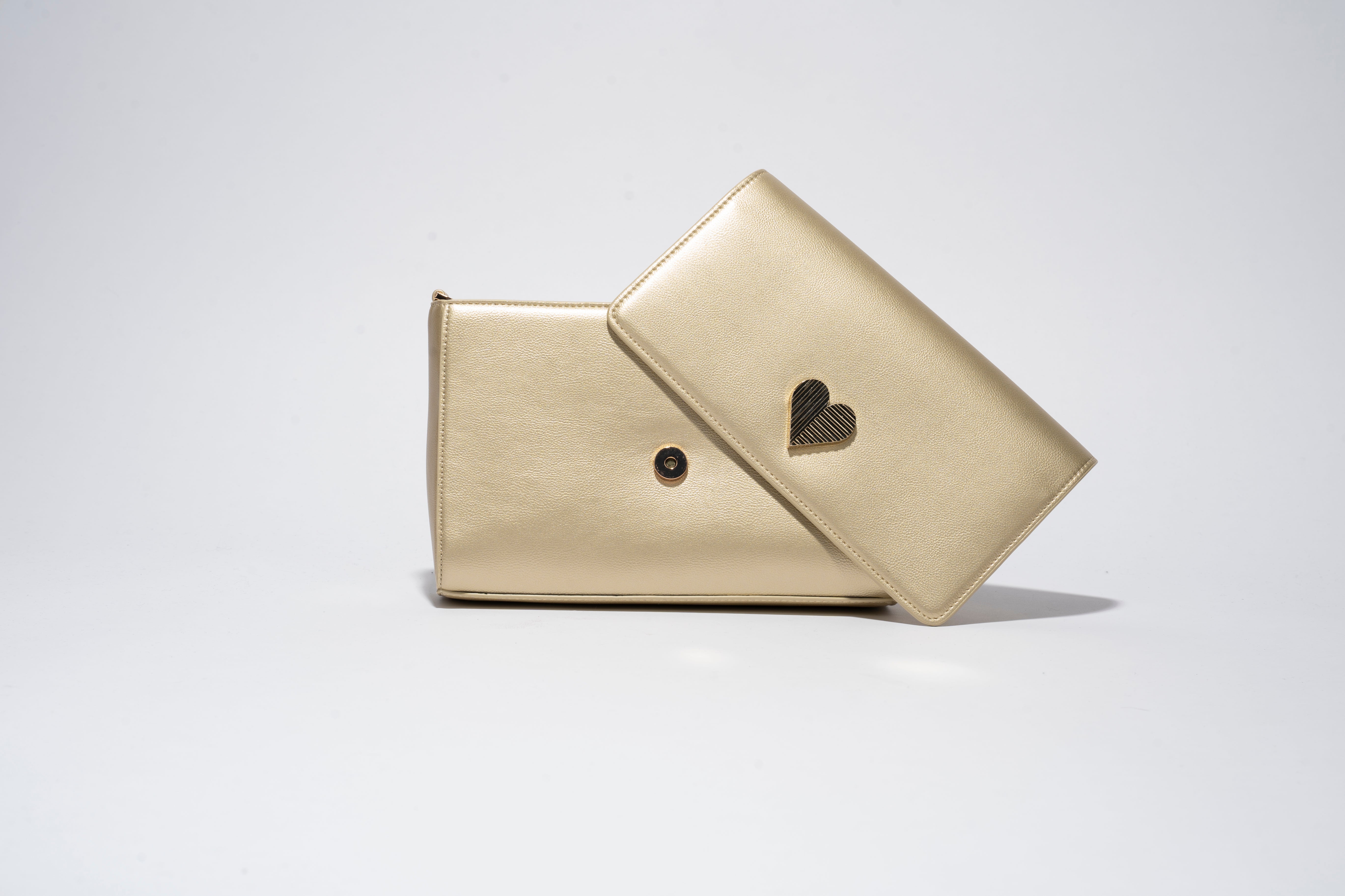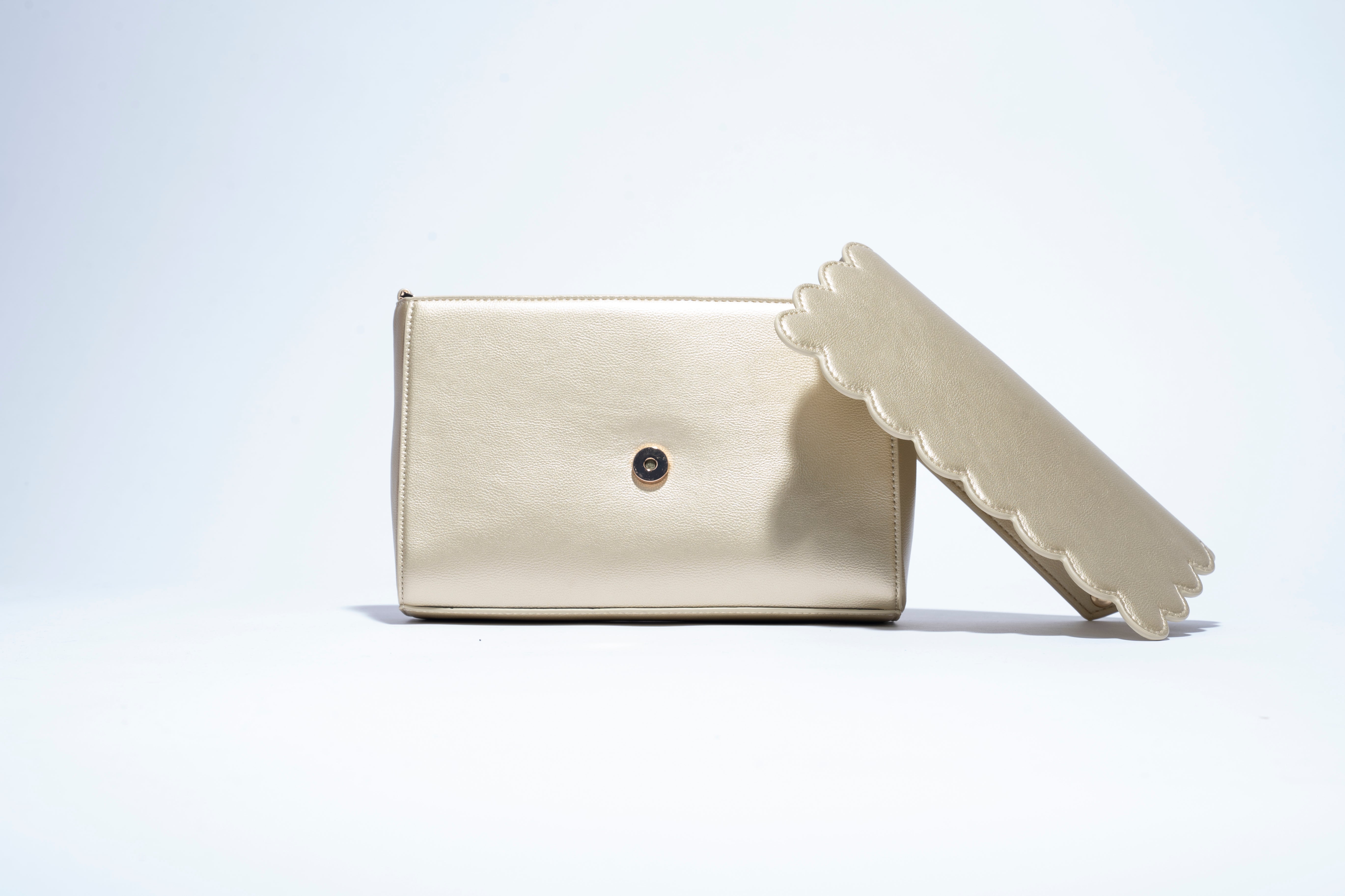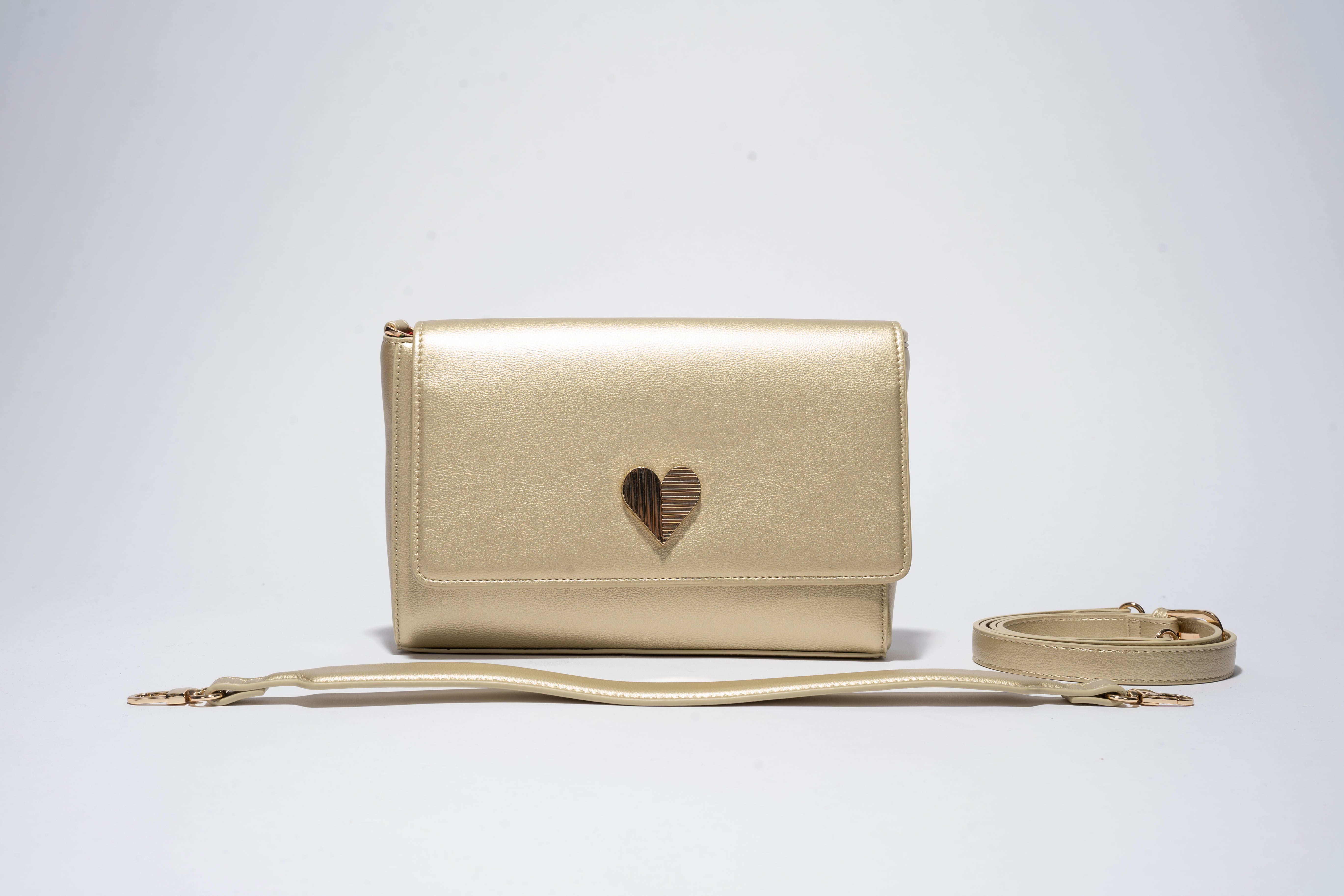 It comes with 2 different flaps that can be snapped on and off of the bag one in gold with a custom made heart logo hardware in gold and one in gold with scalloped edges.