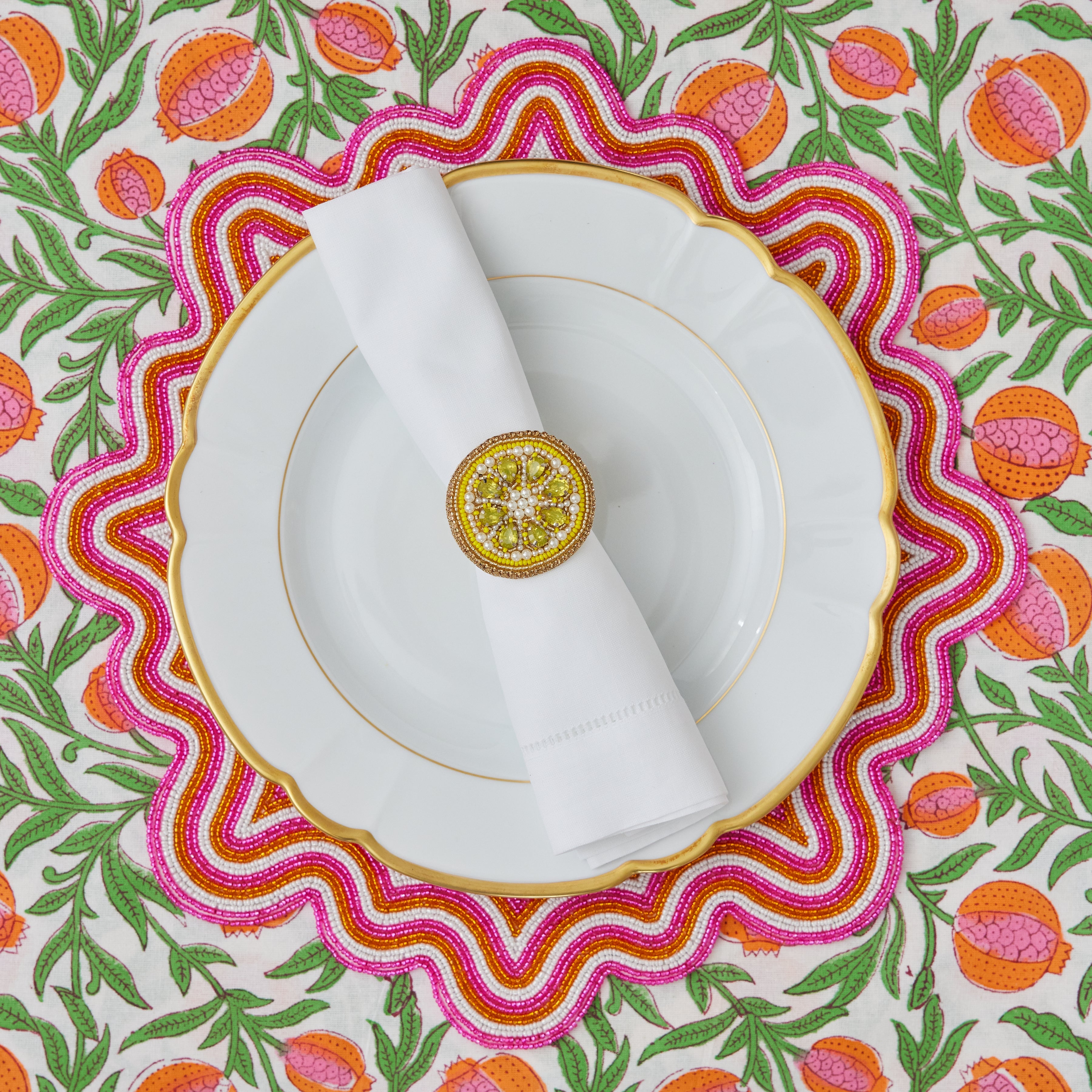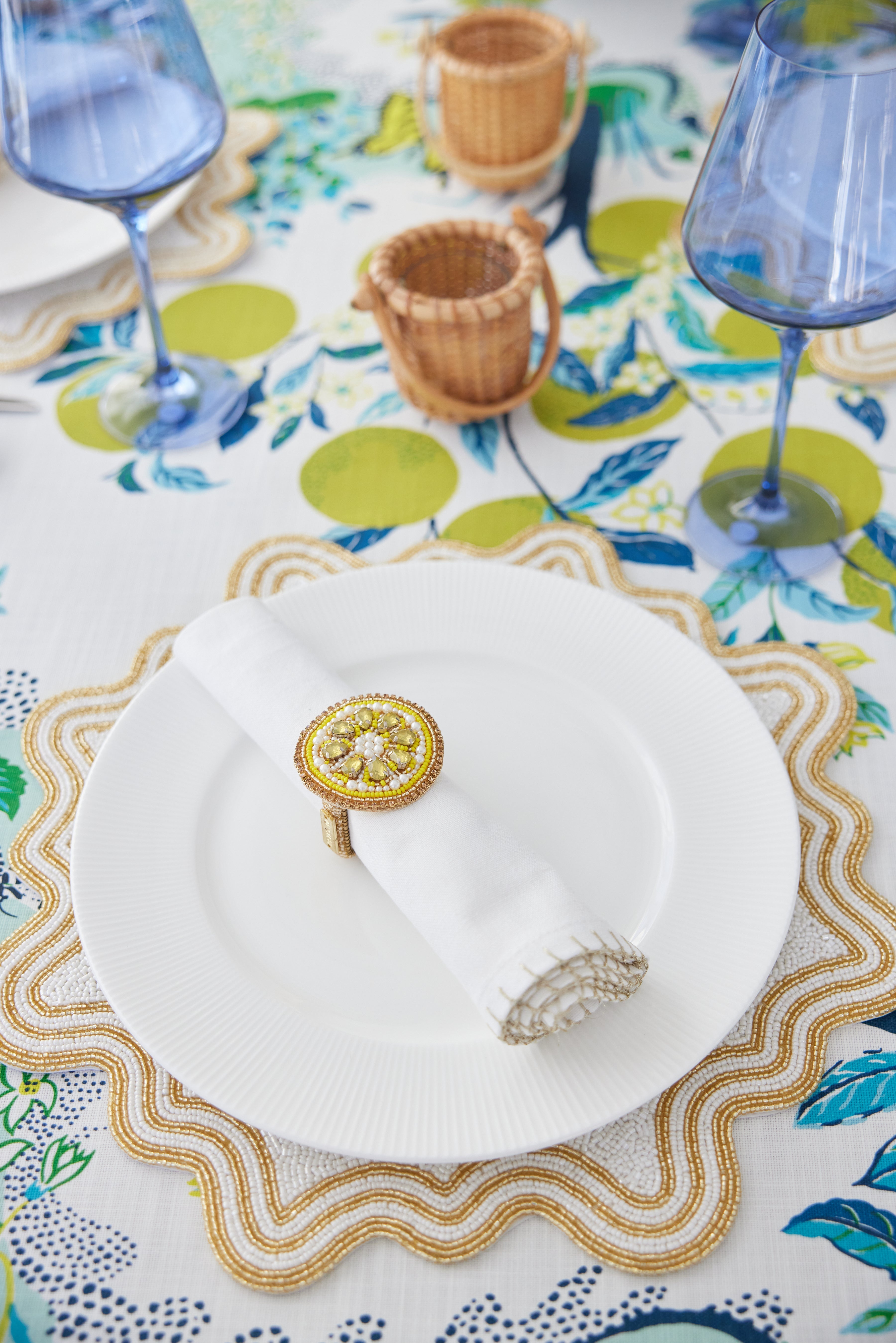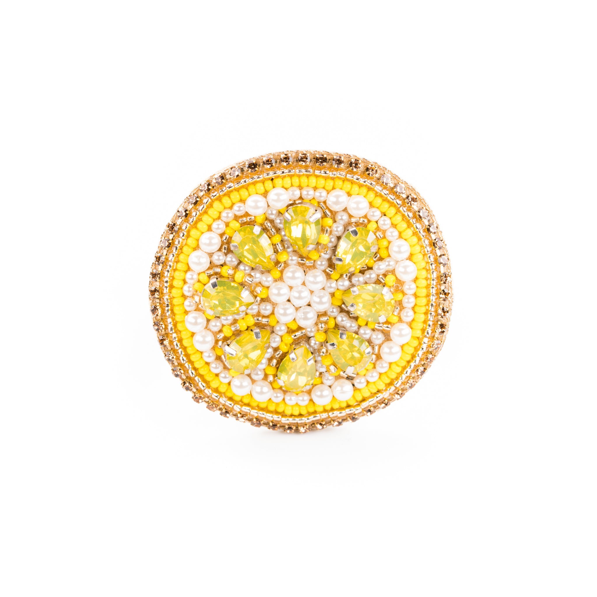 Our Lemon Slice napkin ring features a combination of bead embroidery, rhinestones and pearls.