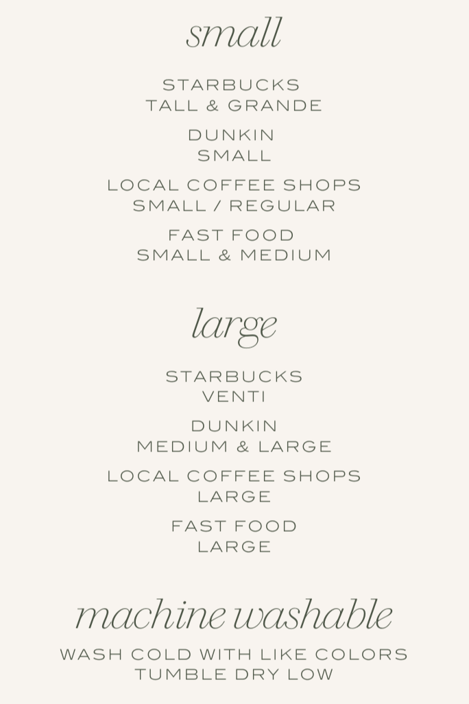Fits a variety of cups (typically 22oz or a little larger) including: Dunkin medium, Starbucks venti) Also fits my standard glassware and my child's sippy cup lol!!
