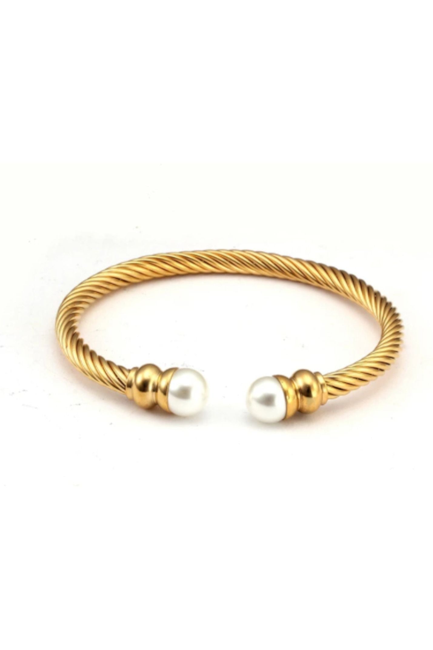 This is a timeless classic bracelet that your customers will love. Simple and elegant. - gold plated stainless steel - glass pearl - one size fits most - adjustable with a squeeze