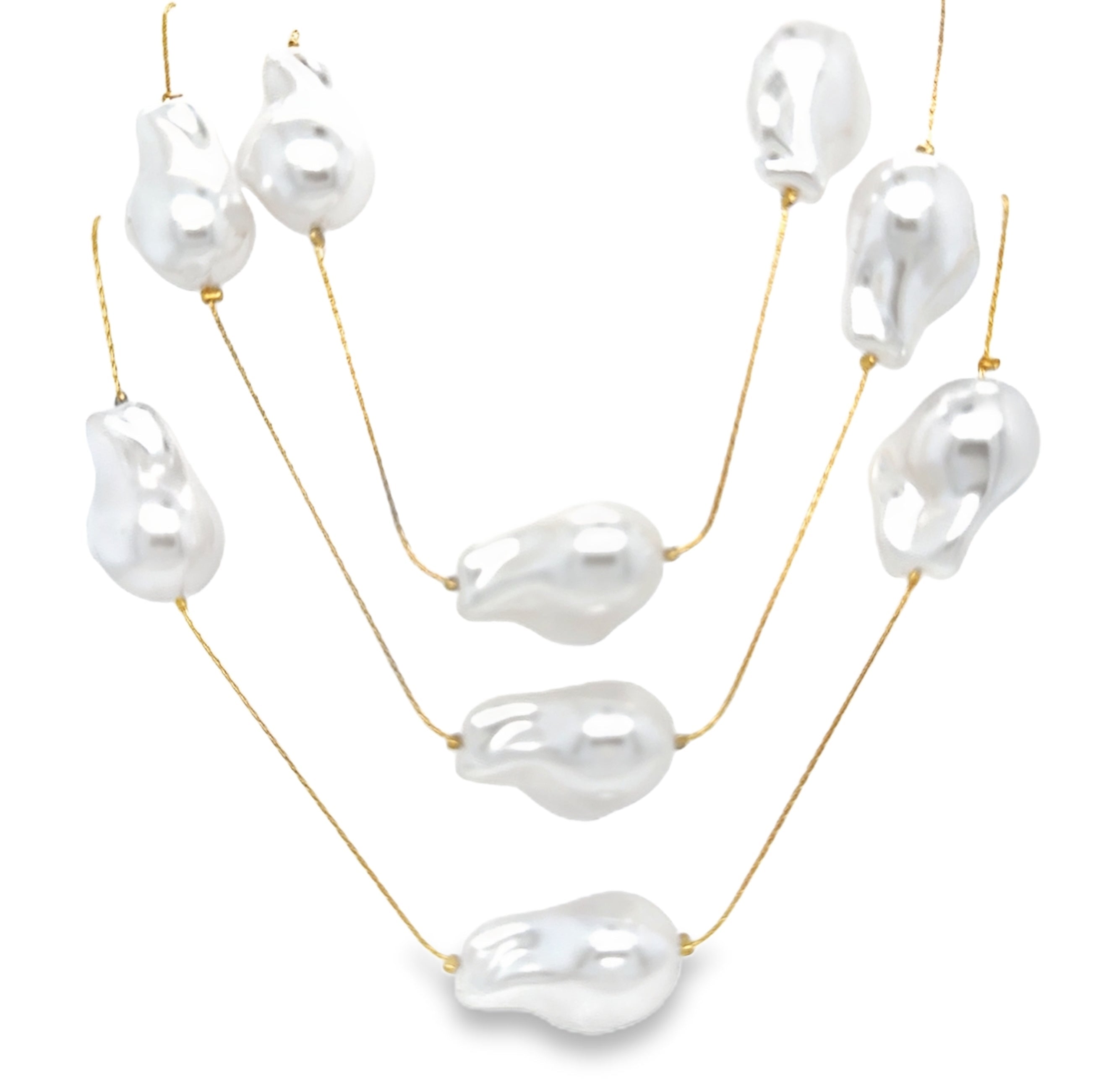 Necklace with 3 strands of baroque pearl and gold plated chain.