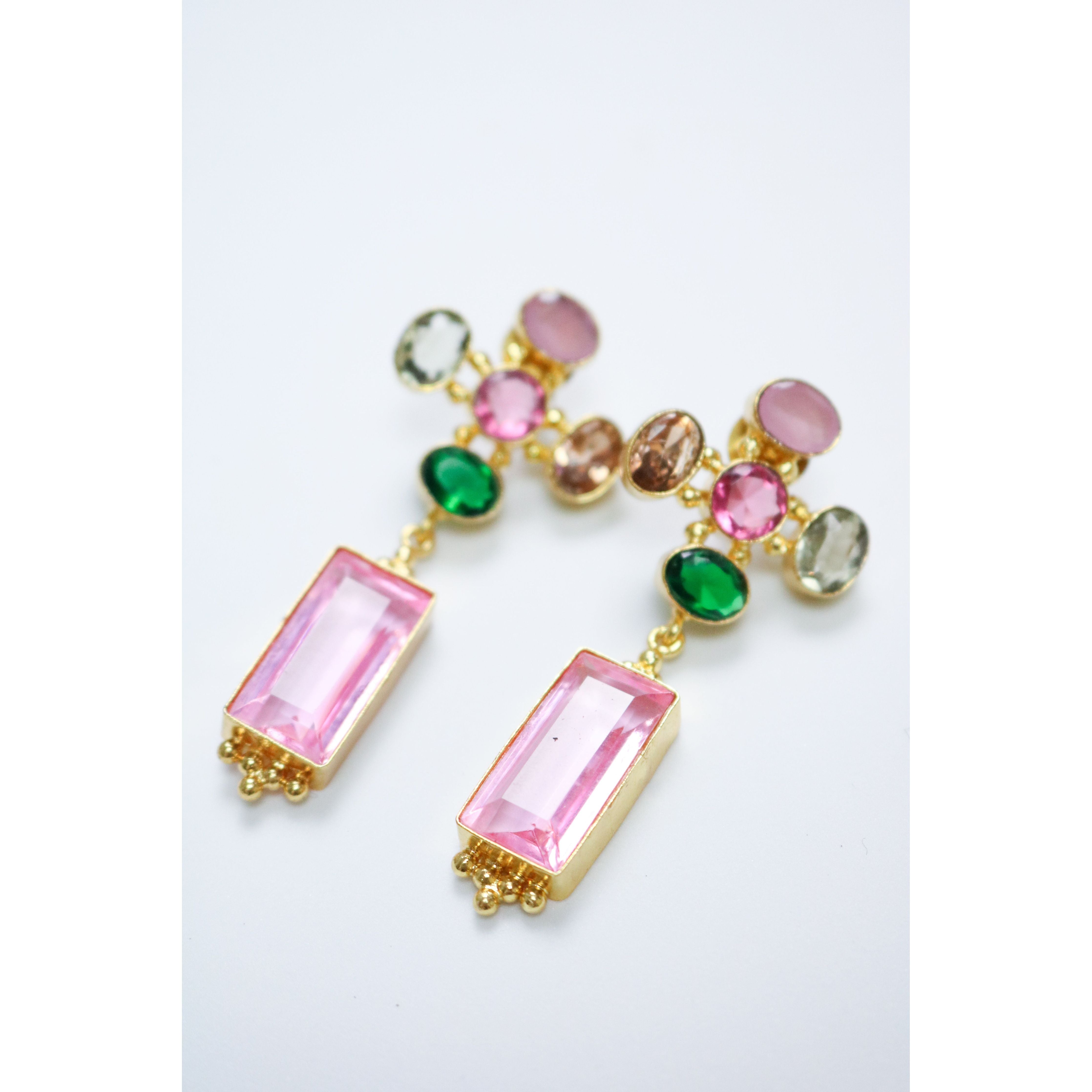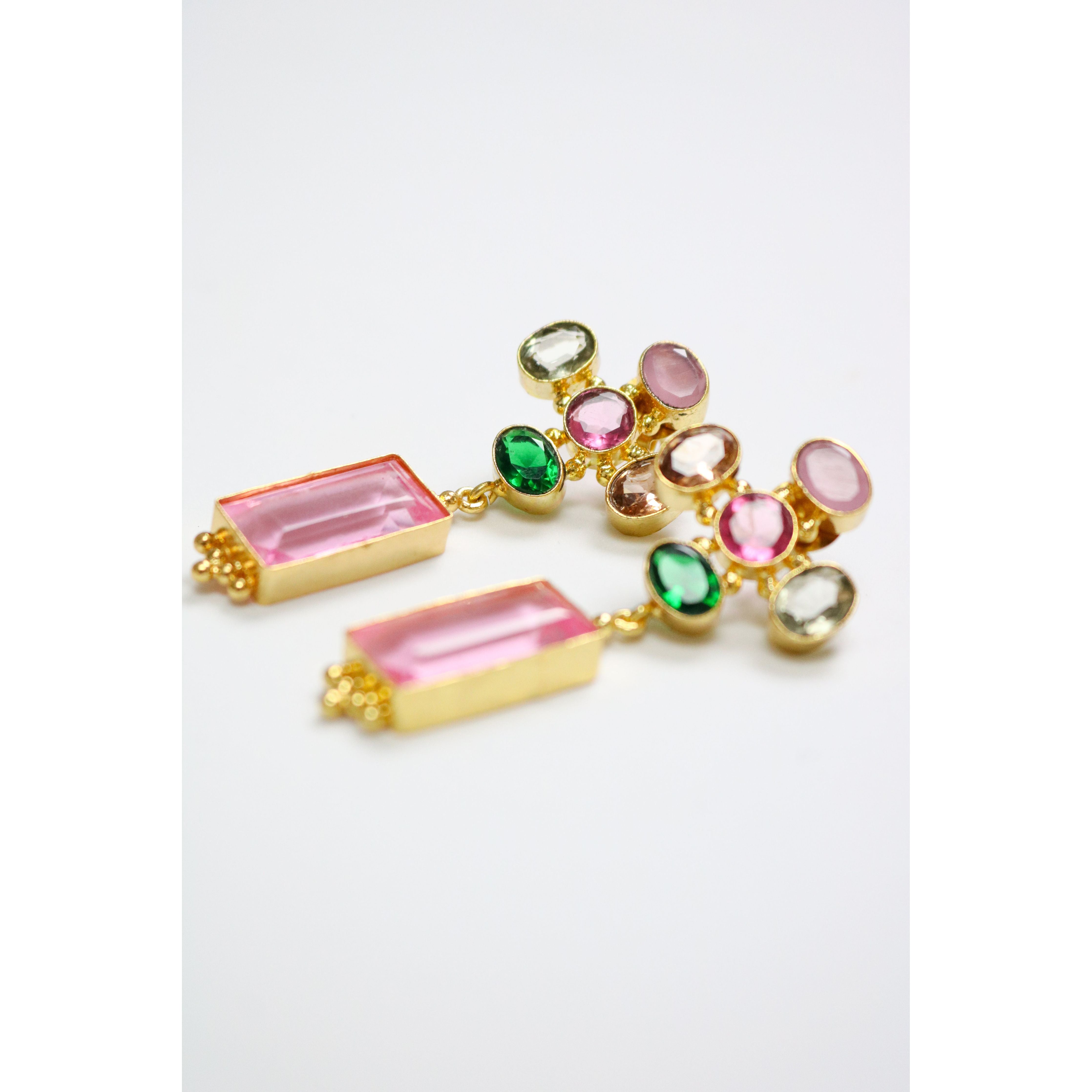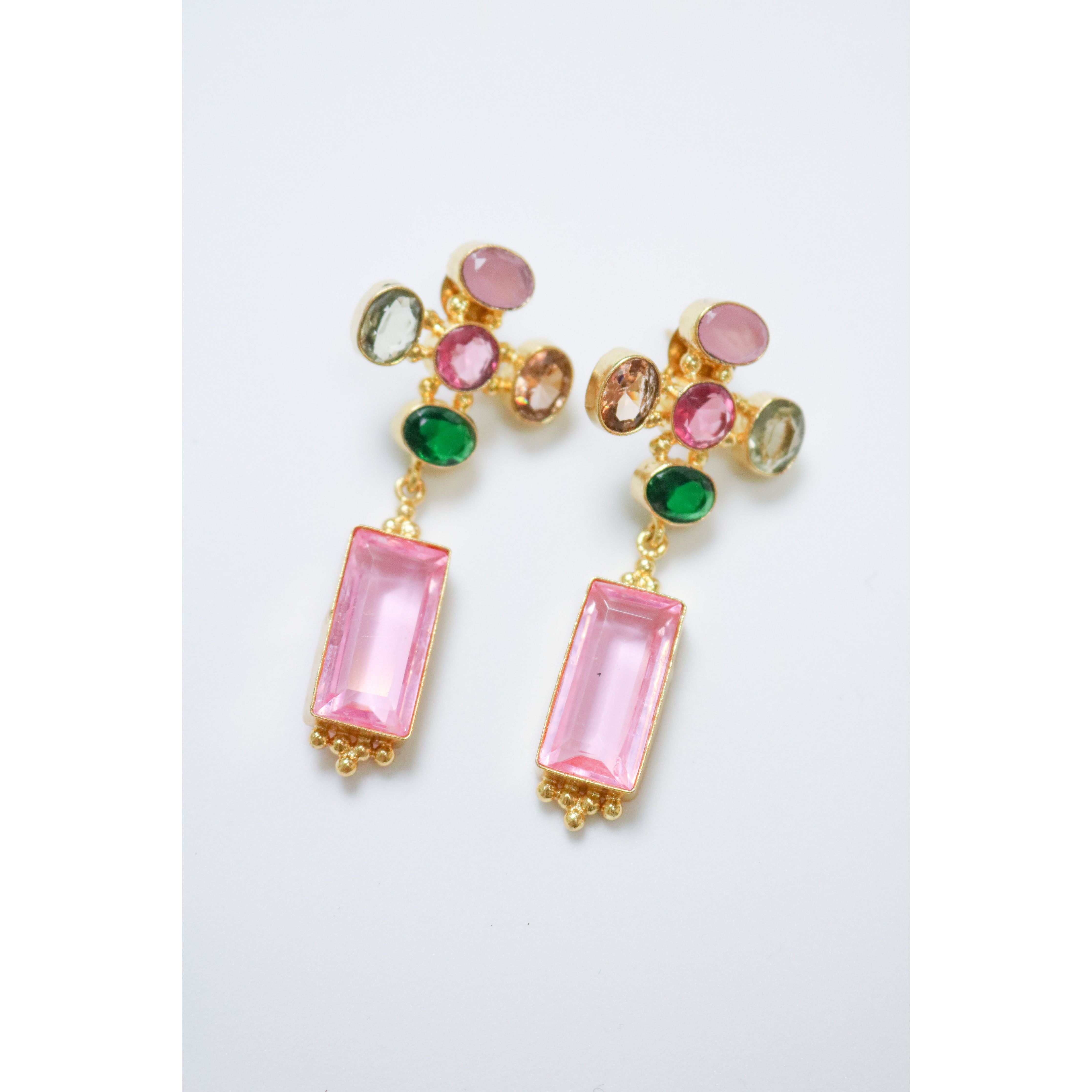 - 22Kt Gold Plated Rose Quartz, Aqua Blue Quartz, Morganite Quartz, Chrome Green Quartz, Rubellite Quartz Flower Earring Post
