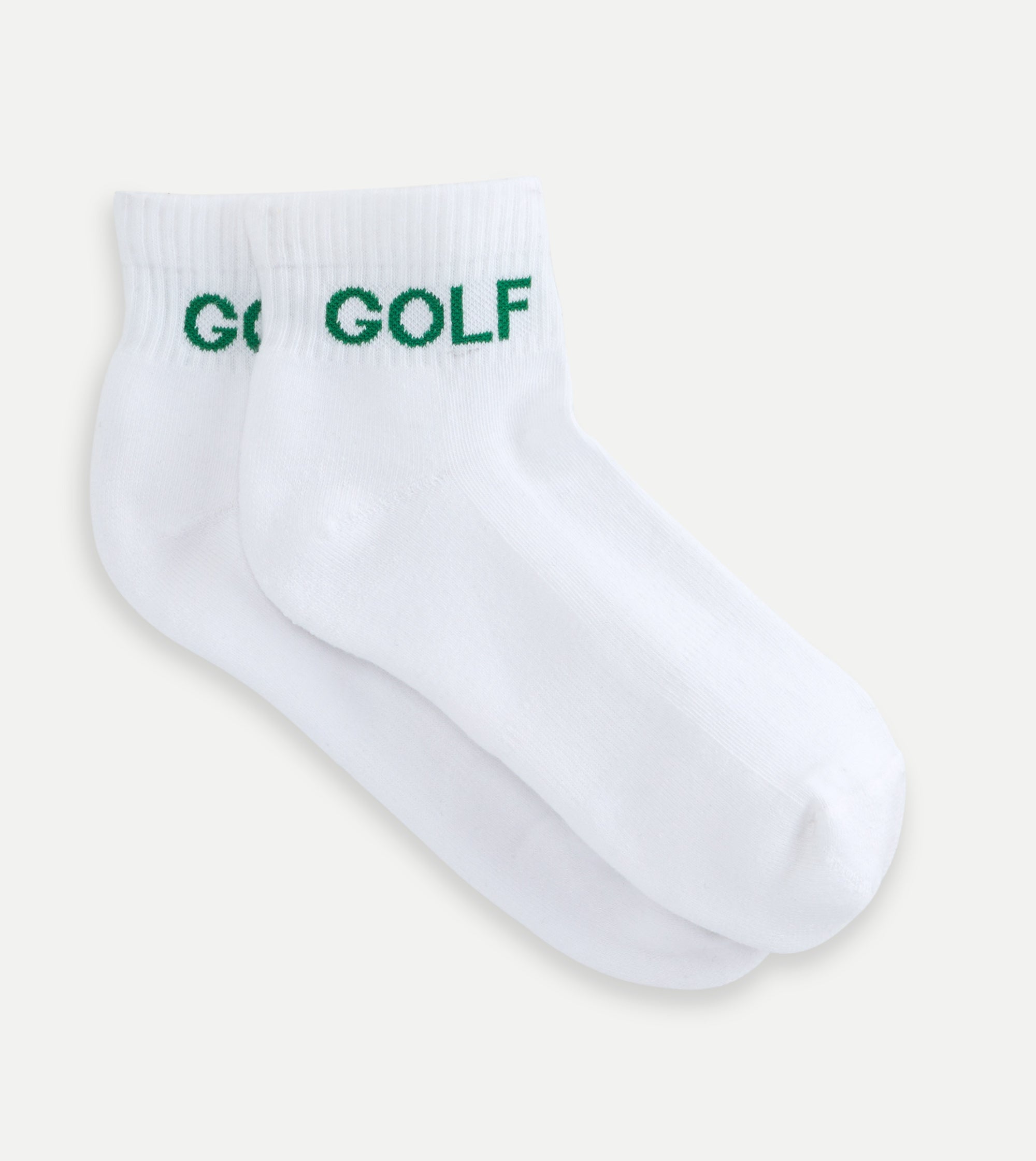 Peruvian cotton low calf sock. GOLF printed on each sock in Green. Cotton nylon spandex blend. Made in Peru. Machine Wash.