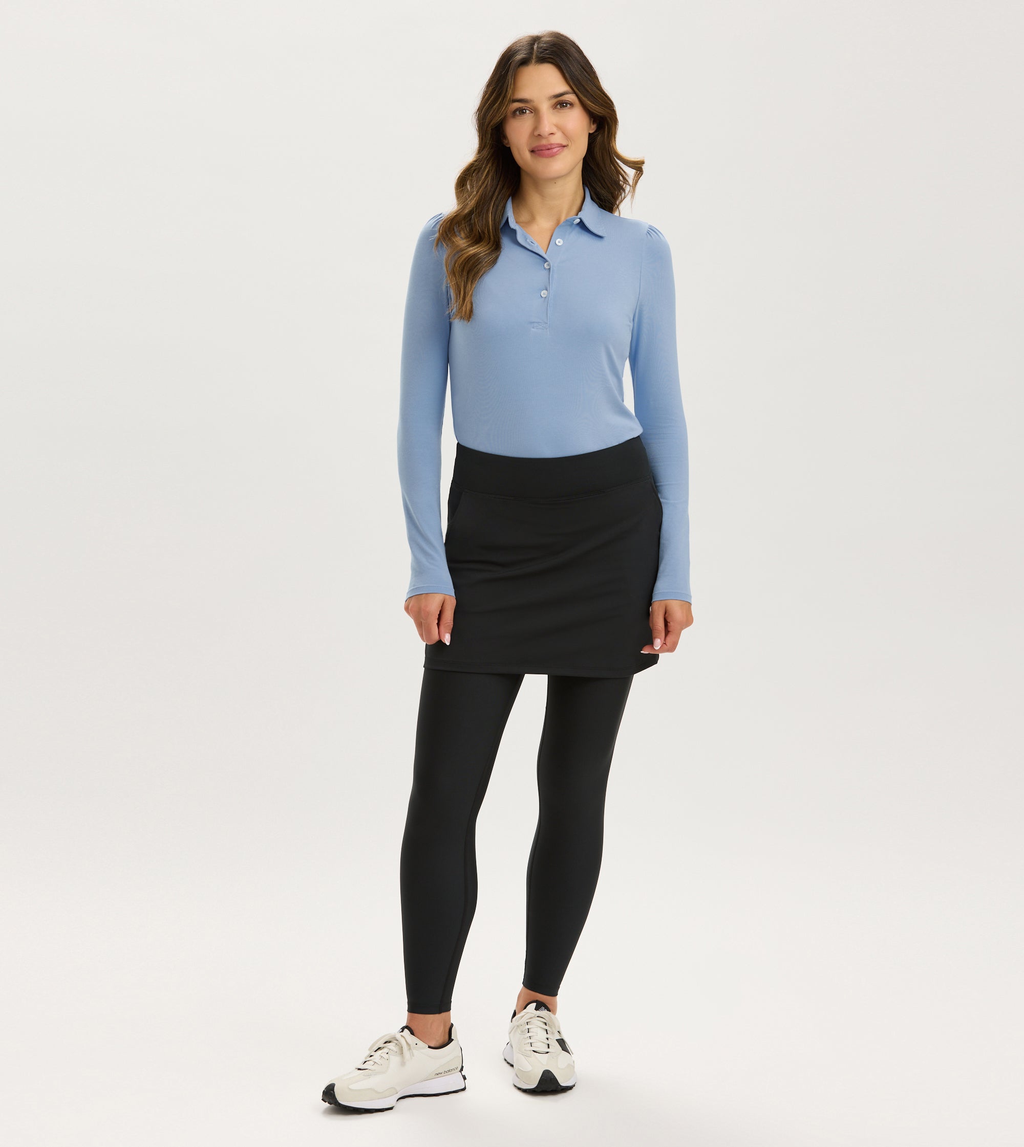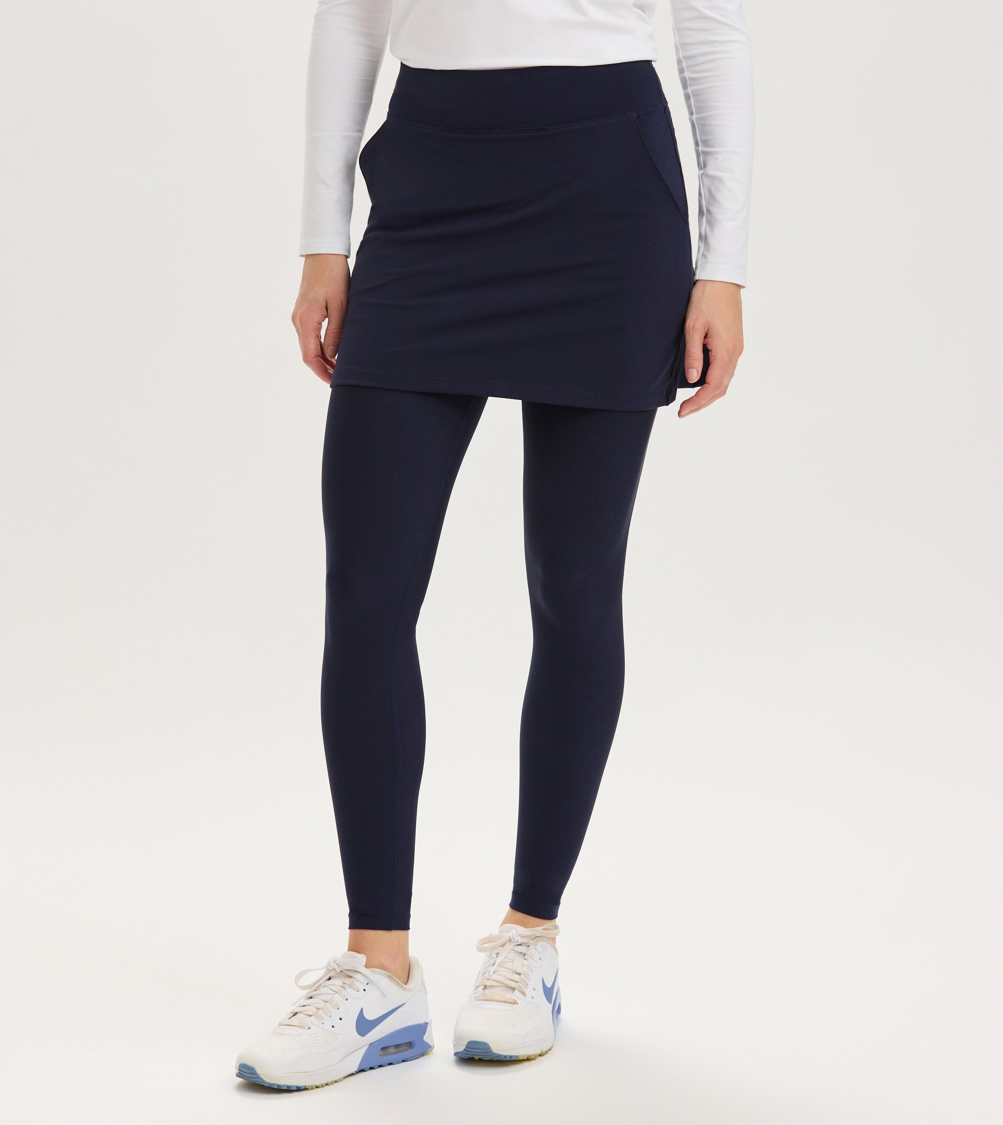 Performance skirt with a built-in legging lets you extend the golf season! We combined two best sellers to create the Pleat Back Skirted Legging. Skirt is 15 1/2 inches long. Side pockets in the skort. 26 1/2” inseam legging. Polyester spandex performance fabric is lightweight and supportive. Imported. Machine Wash.