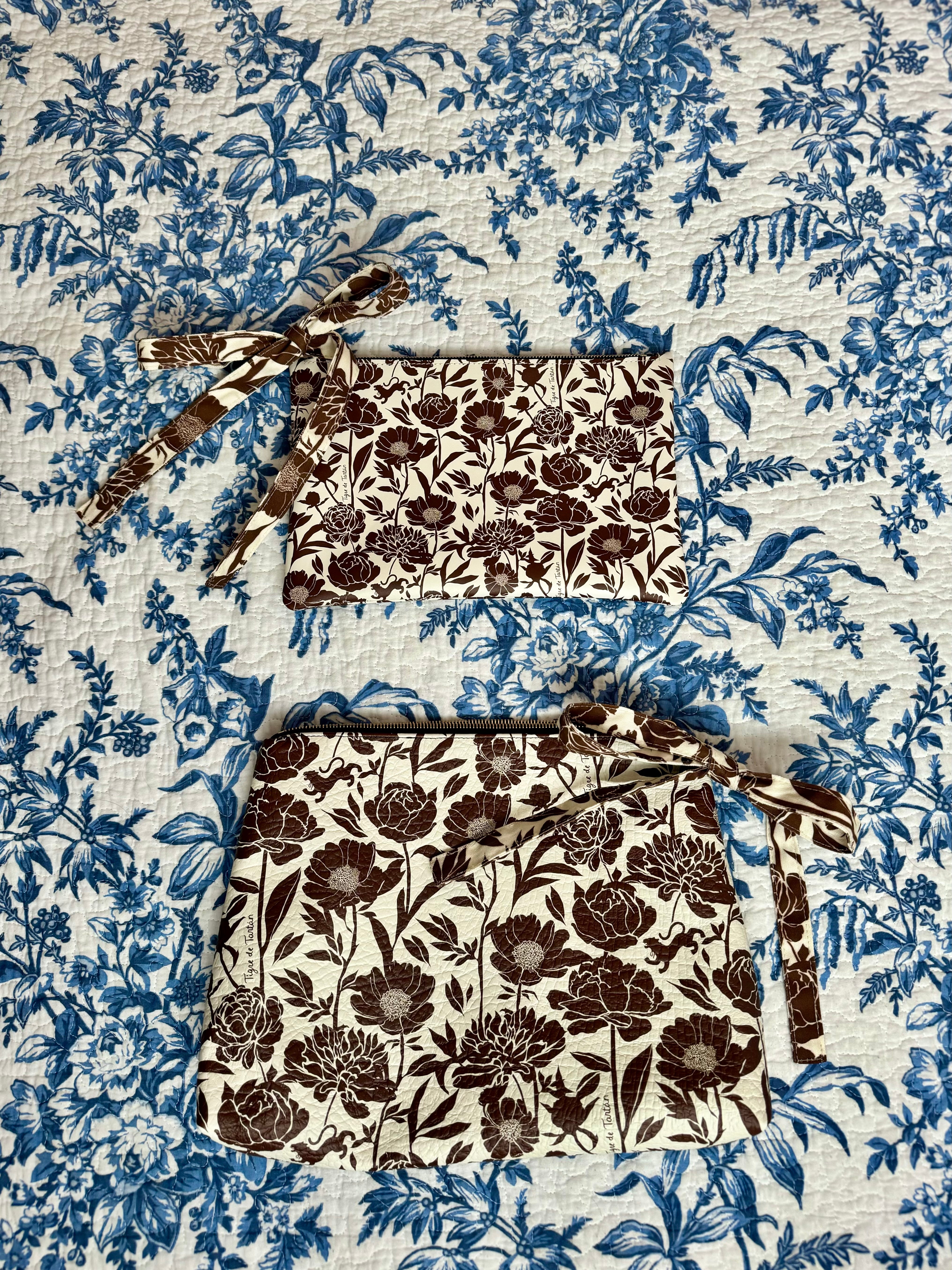 Featuring our exclusive house prints, a satin lined interior and a brass finished finger ring pull, this amply sized bag is sure to keep your tote tidy or keep your style fresh when you want a simple bag on the go! Brought to life by an independent female artist, each of the elements, including our signature trompe l'oeil gold buttons, are carefully drawn and custom printed on textured Nappa leather. Hand made to order in London, England.