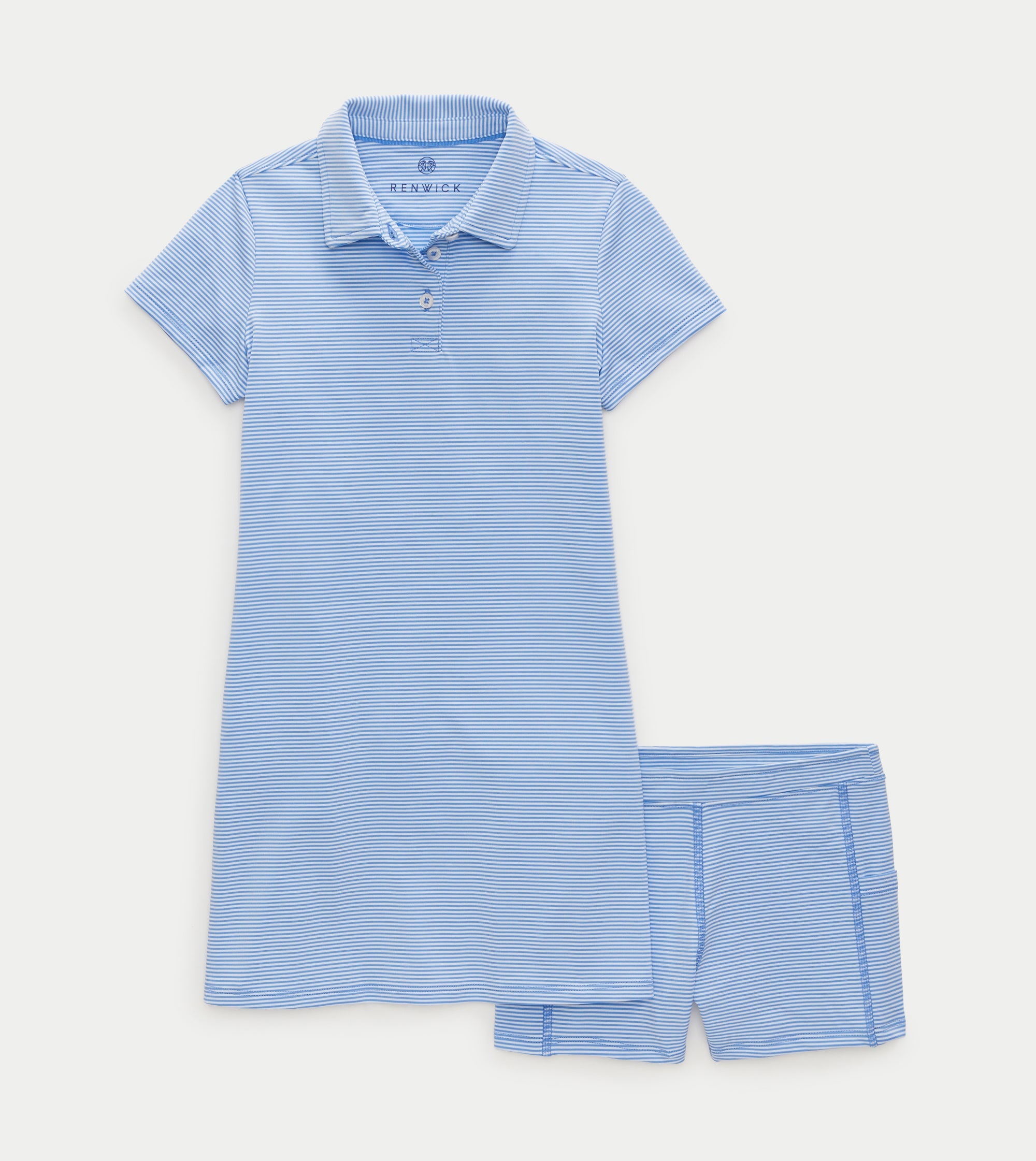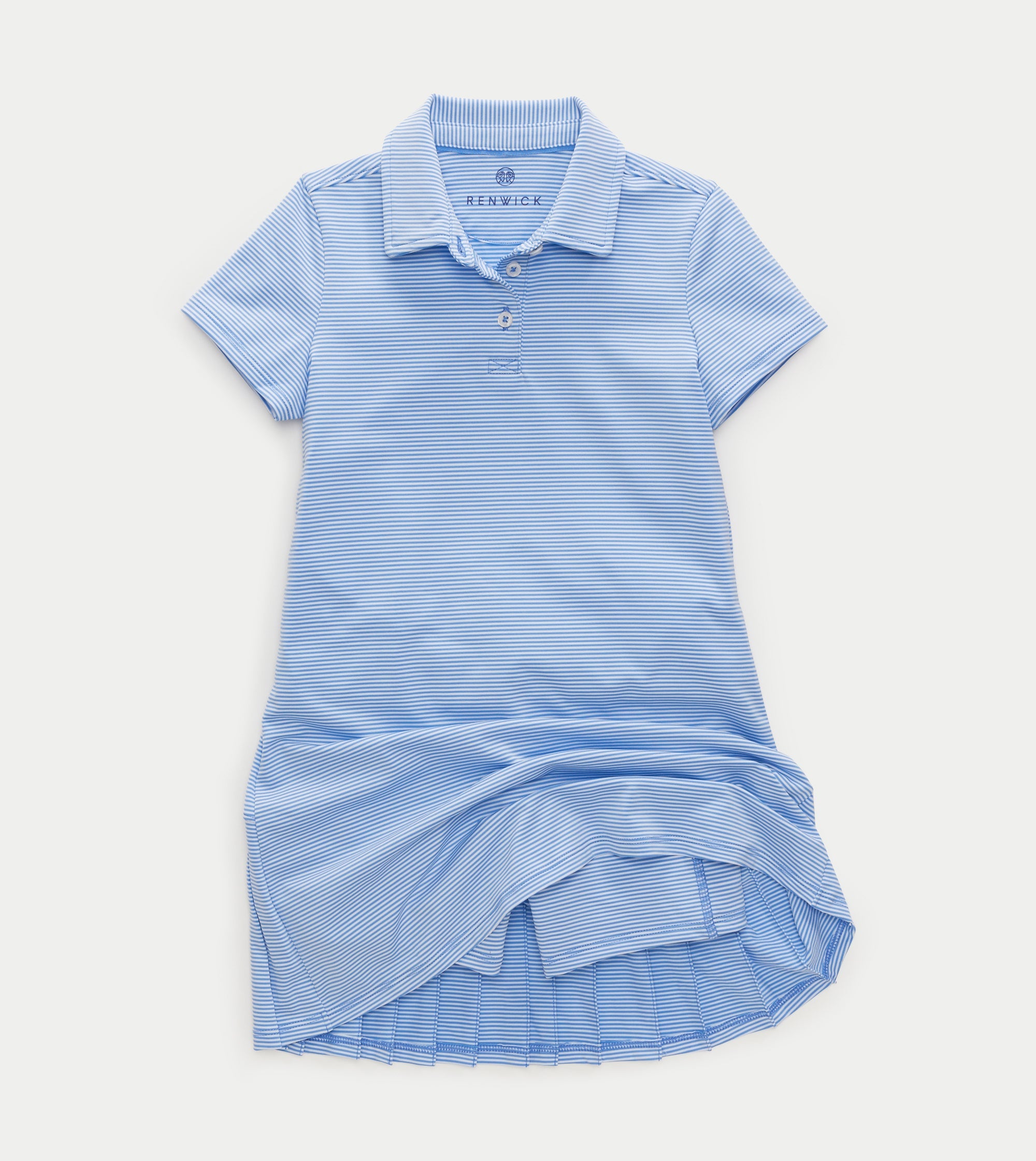 Short sleeve, allover stripe. 3 button placket, back pleats. Polyester spandex performance fabric. Machine wash. Imported. Sizes: XS (2-3), S (4-5), M (6-7), L (8-10), XL (12)