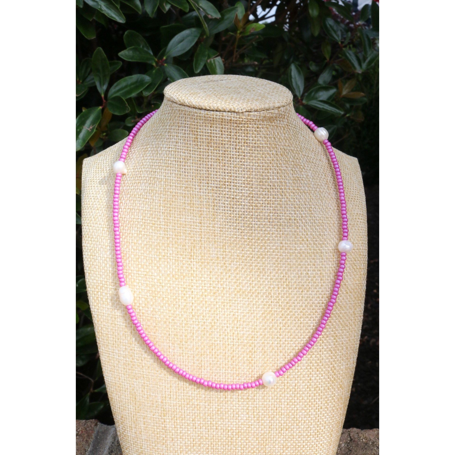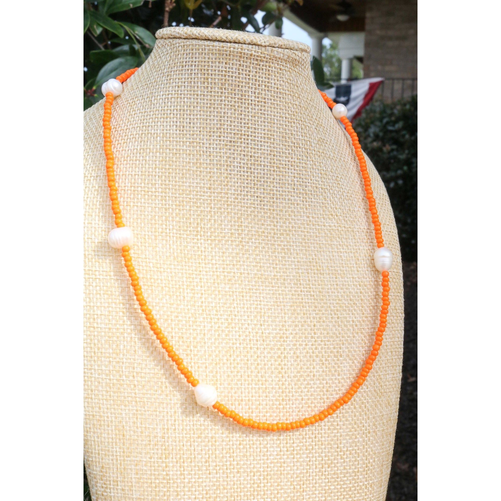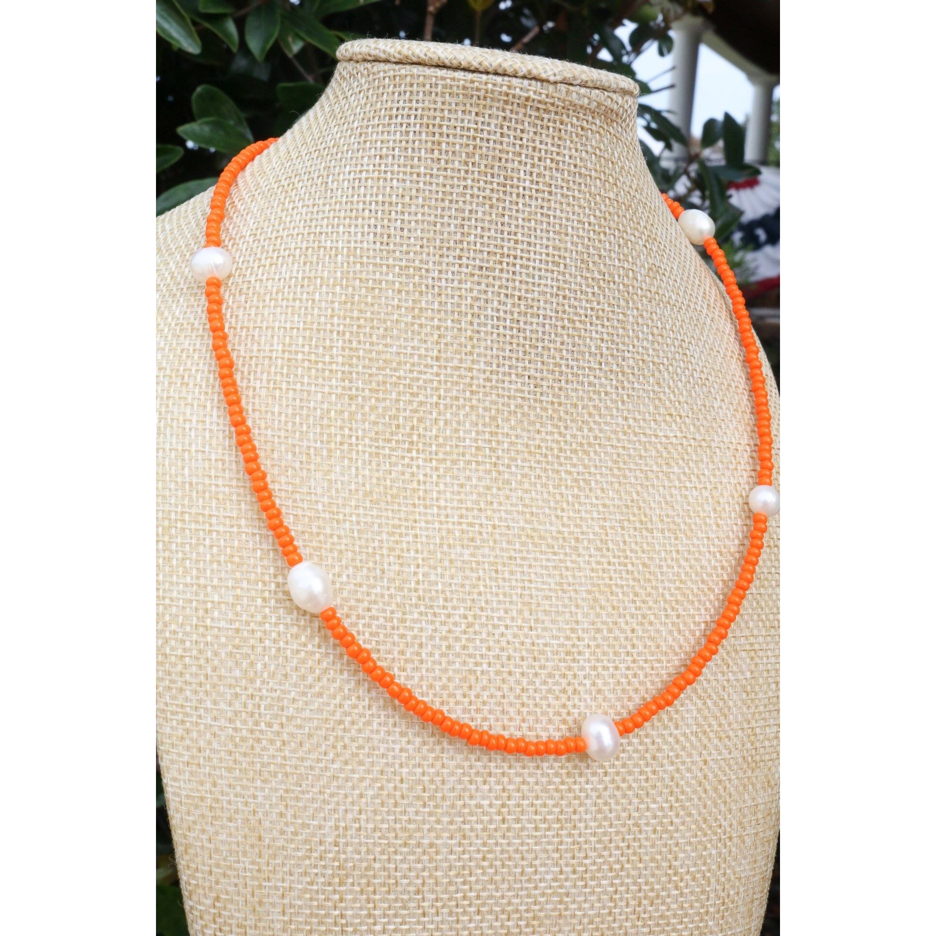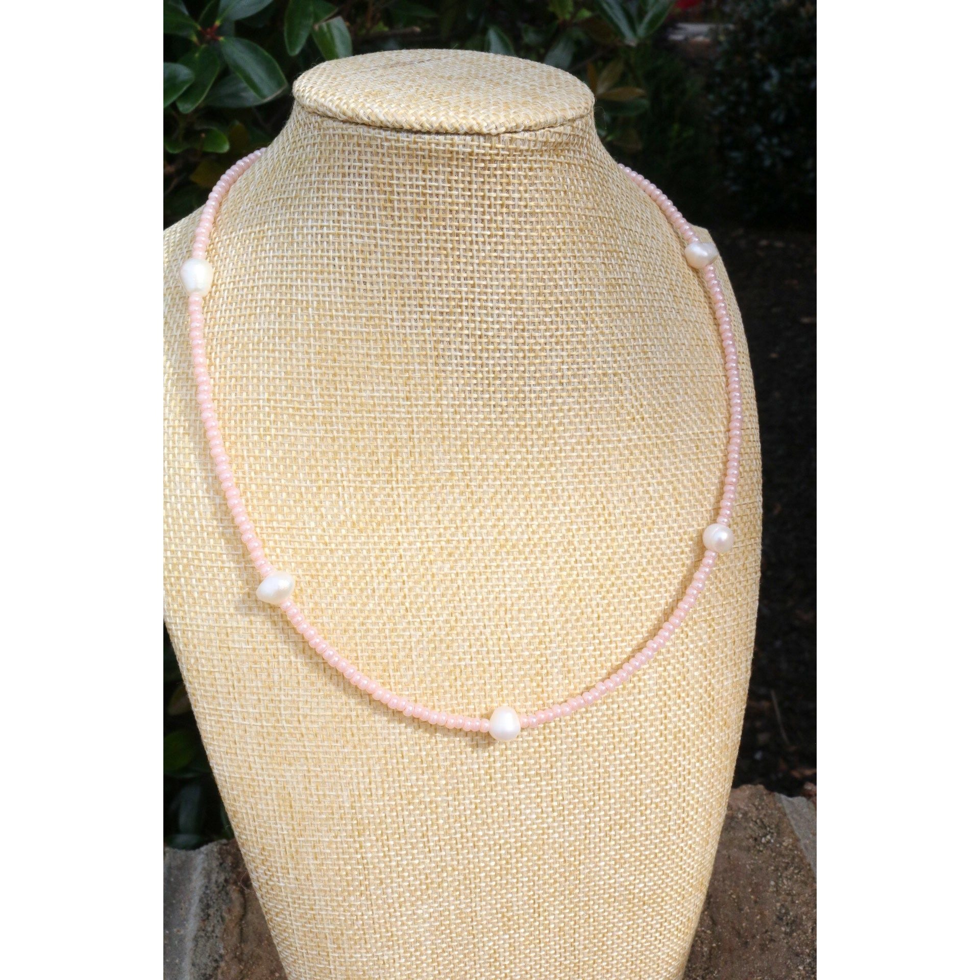A dainty yet stackable choker necklace comes in your fave color or your team's best color. 5 baroque pearls are separated by smooth glass beads on cord. Adjust it to your length with a claw clasp and extender at end.