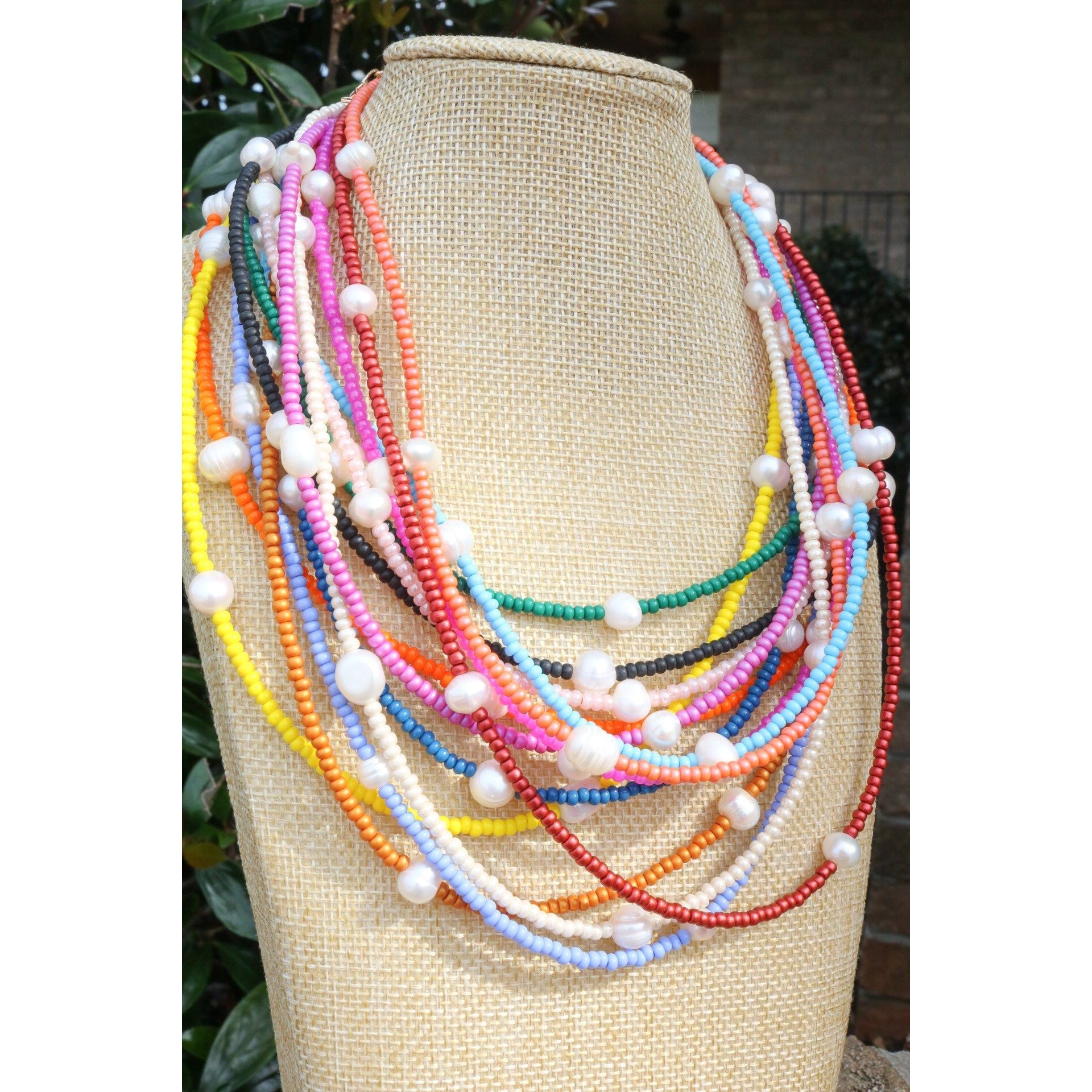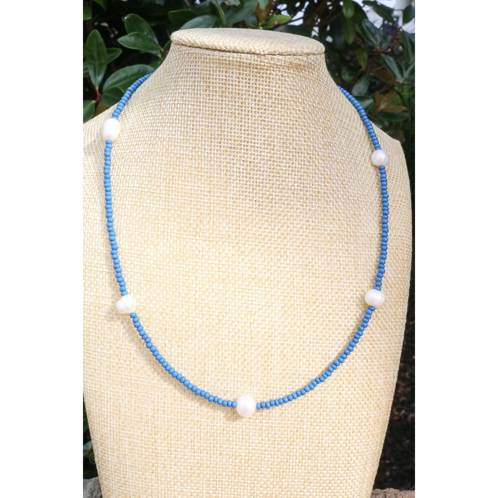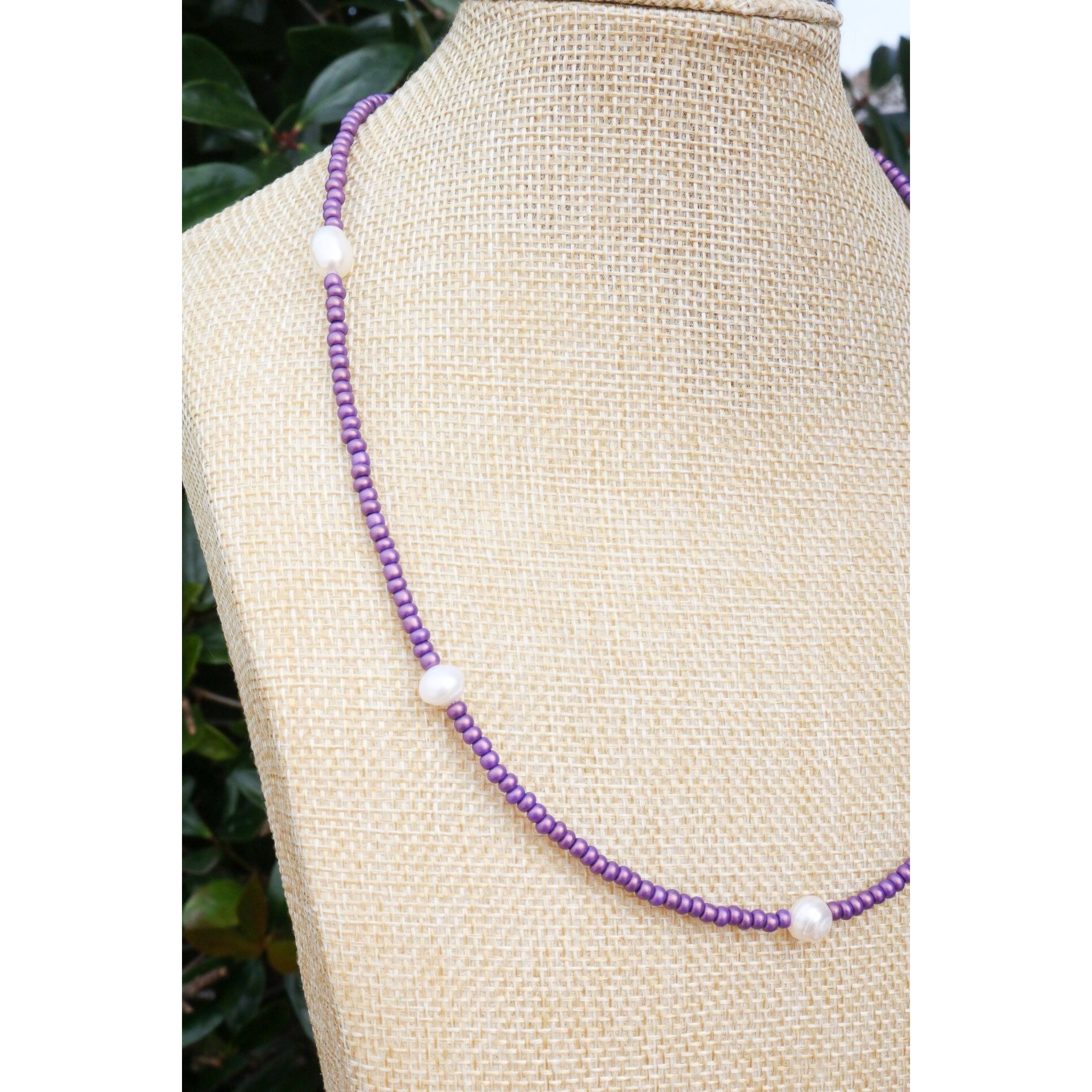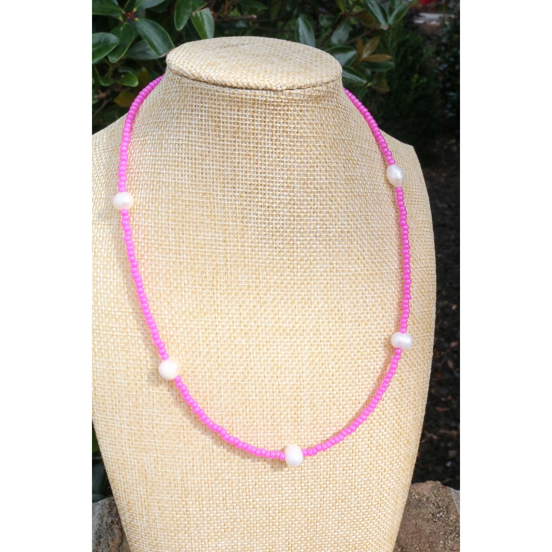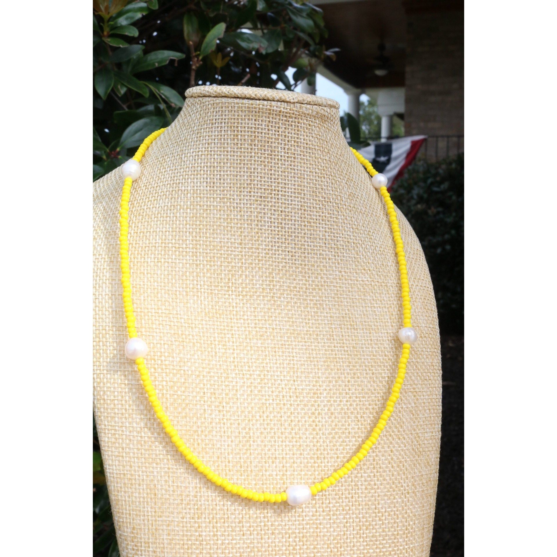 A dainty yet stackable choker necklace comes in your fave color or your team's best color. 5 baroque pearls are separated by smooth glass beads on cord. Adjust it to your length with a claw clasp and extender at end.