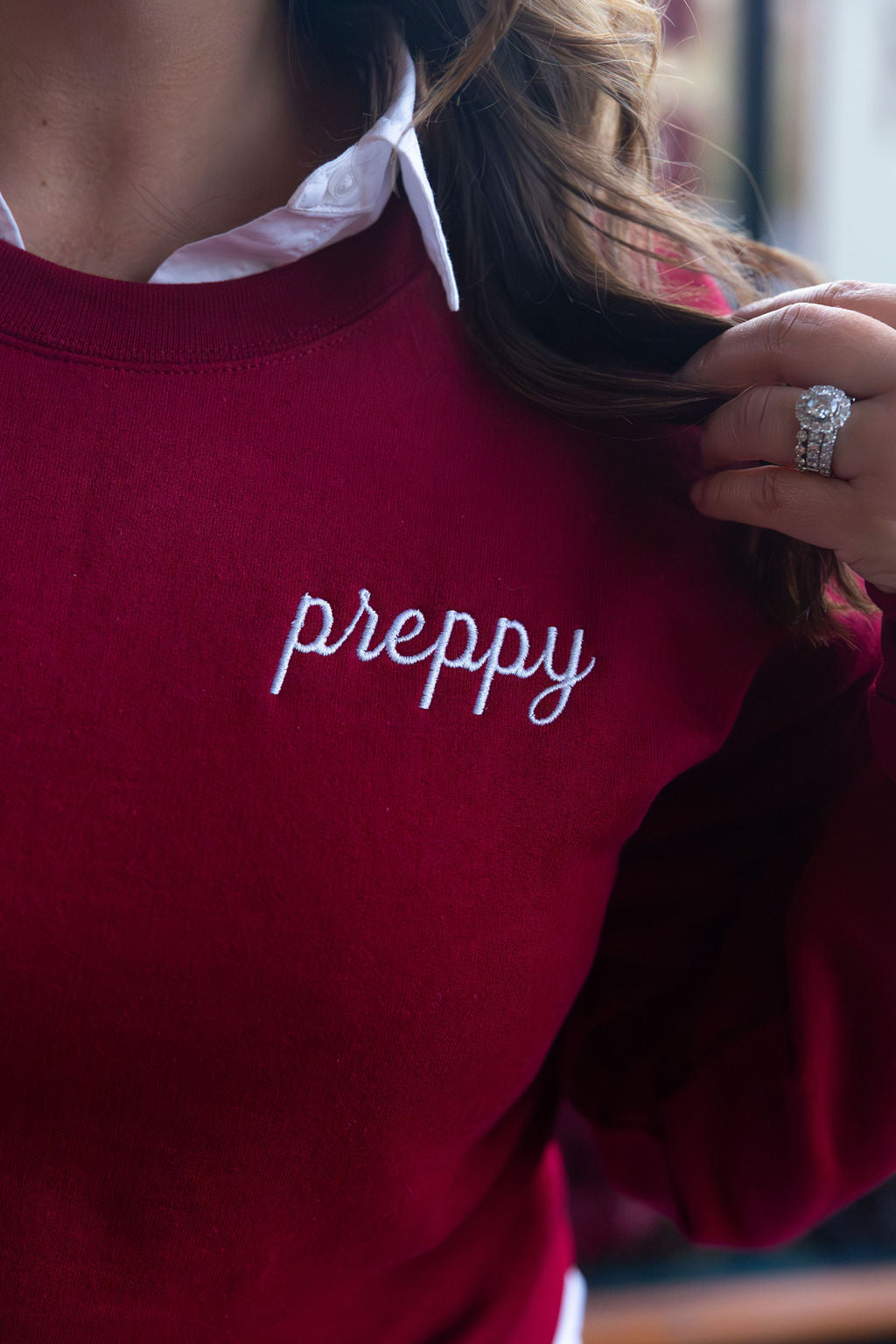 Burgundy sweatshirt with “Preppy” embroidered in a beautiful and subtle script font. Sizes XS-XL