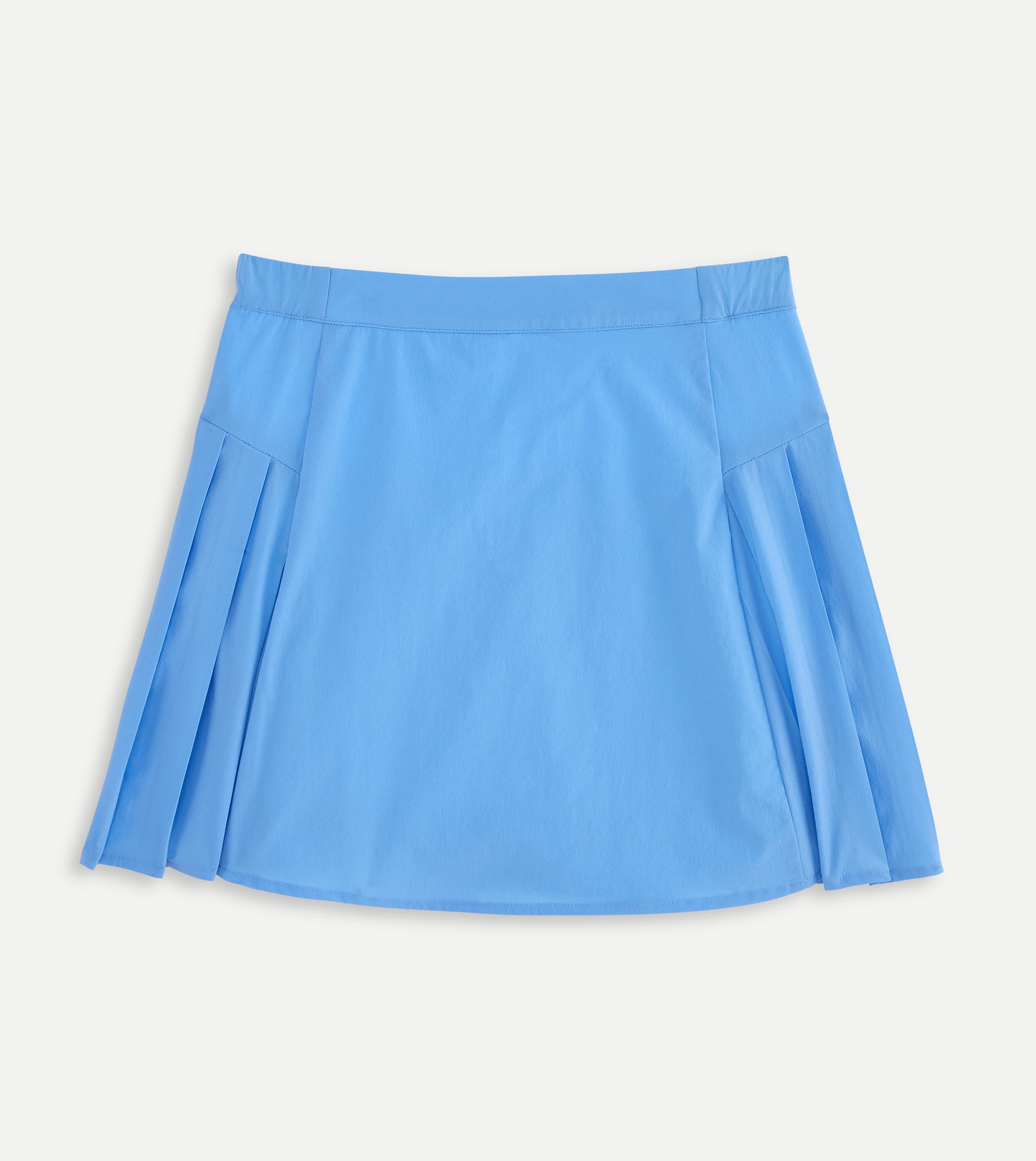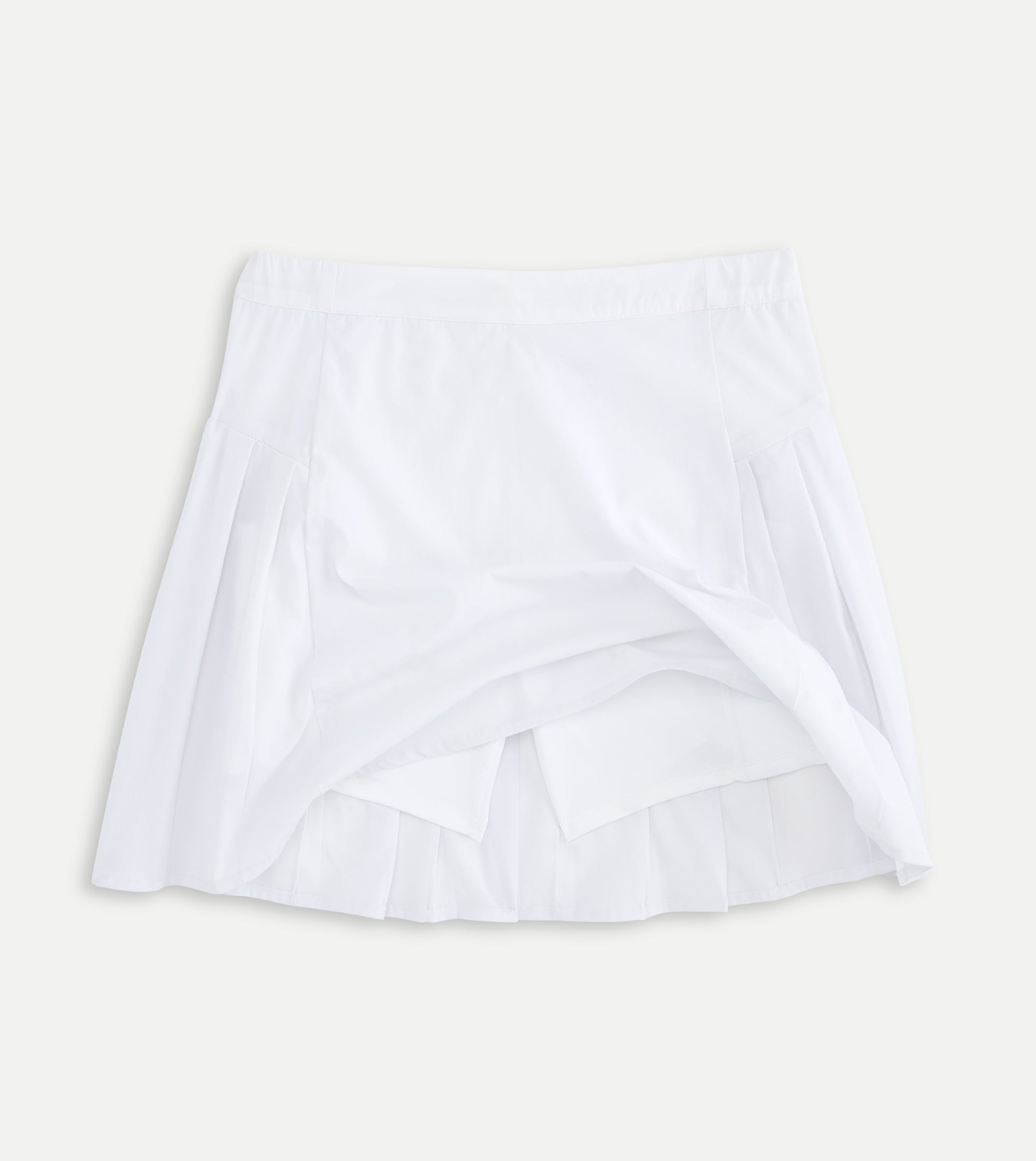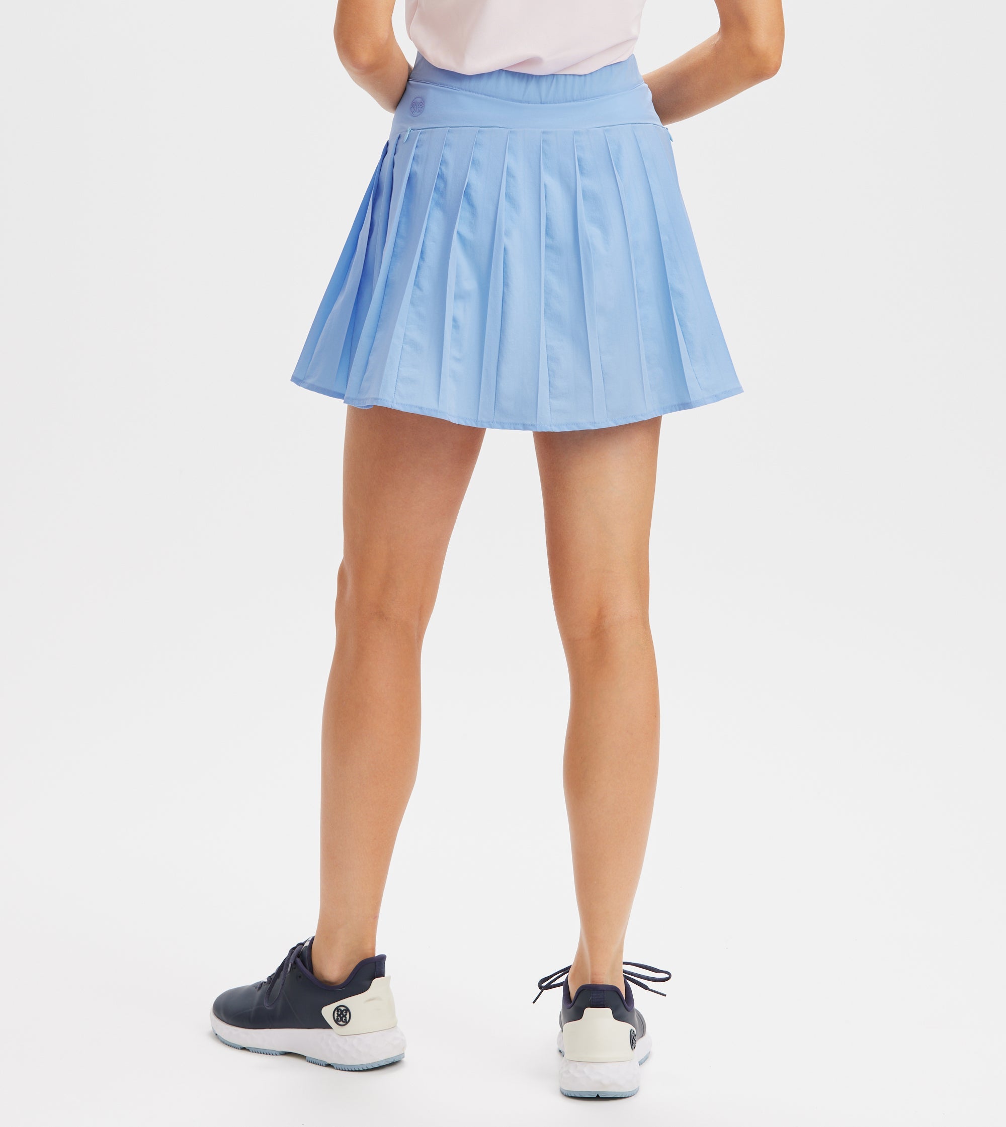 Pull on performance skort with pleated back detailing. Interior bike shorts. Skirt is 16 inches long. Two back zip close pockets and pockets in undershorts for tennis balls. No front/side pockets in the actual skirt. Fabric is nylon spandex performance woven blend. Machine wash. Imported.