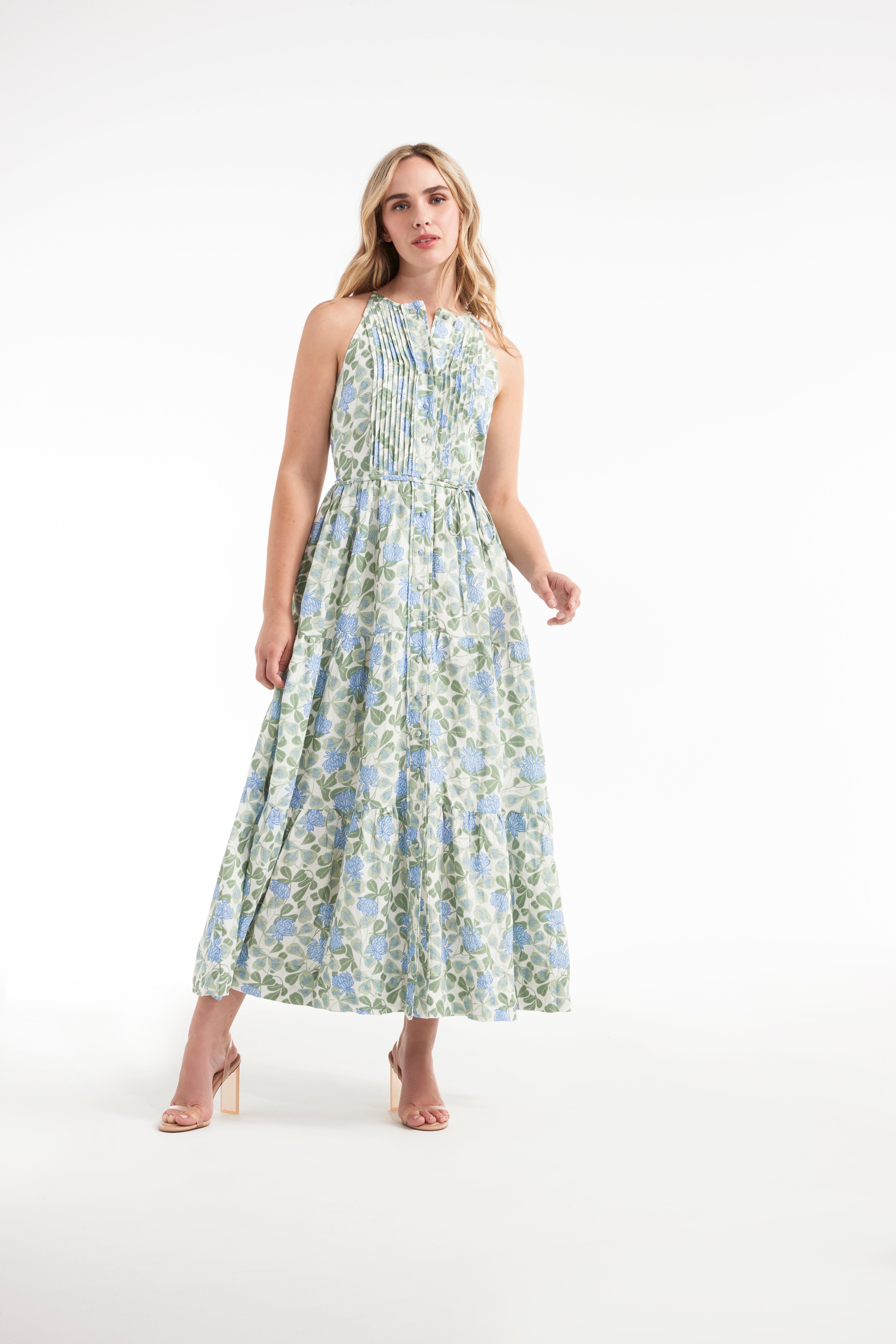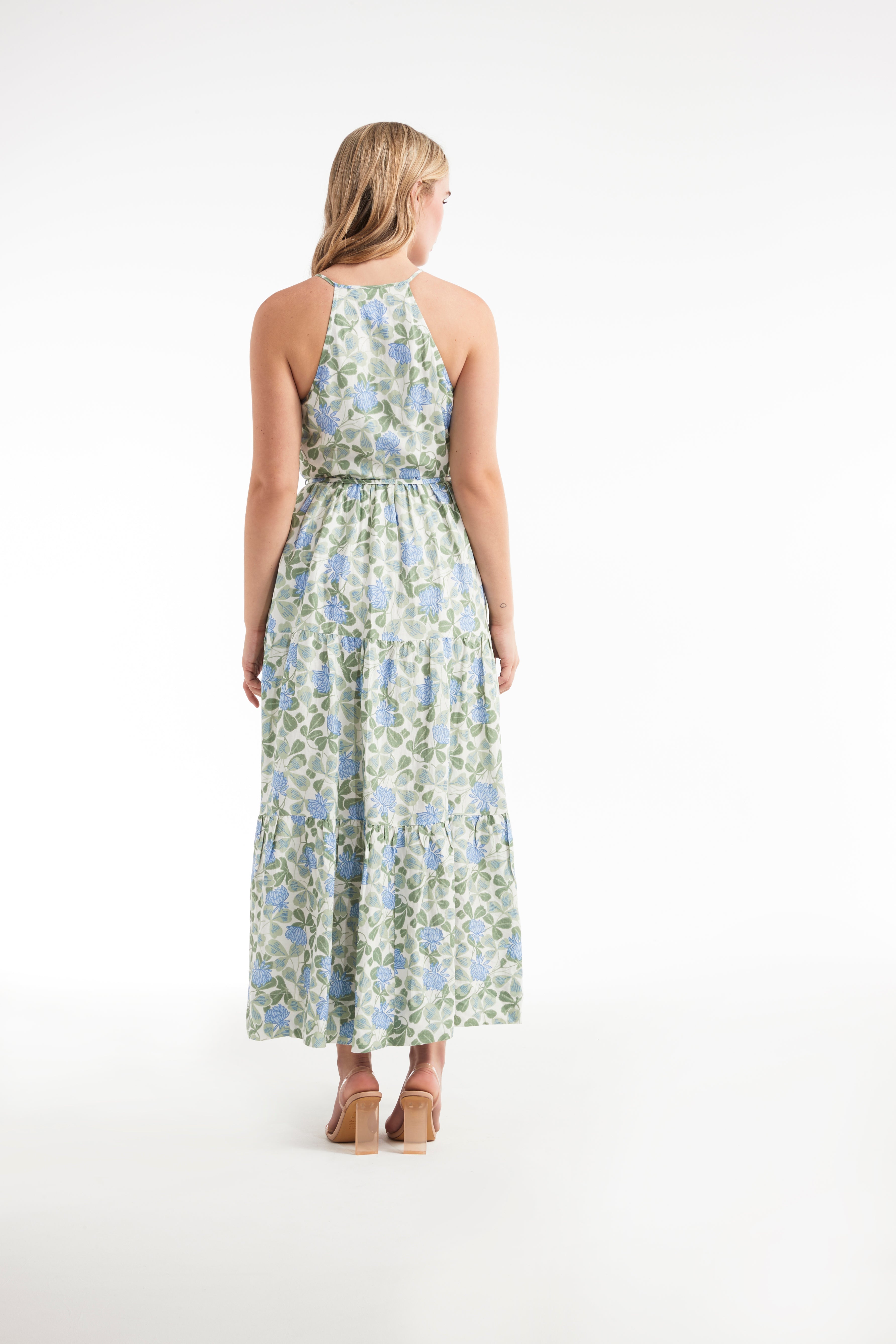 Floral romance embellishes each swish of this haltered, sweeping gown. With tiered and cinched detailing and a clean scooped sleeveless cut, this dress brings enchanting timelessness to event wear.