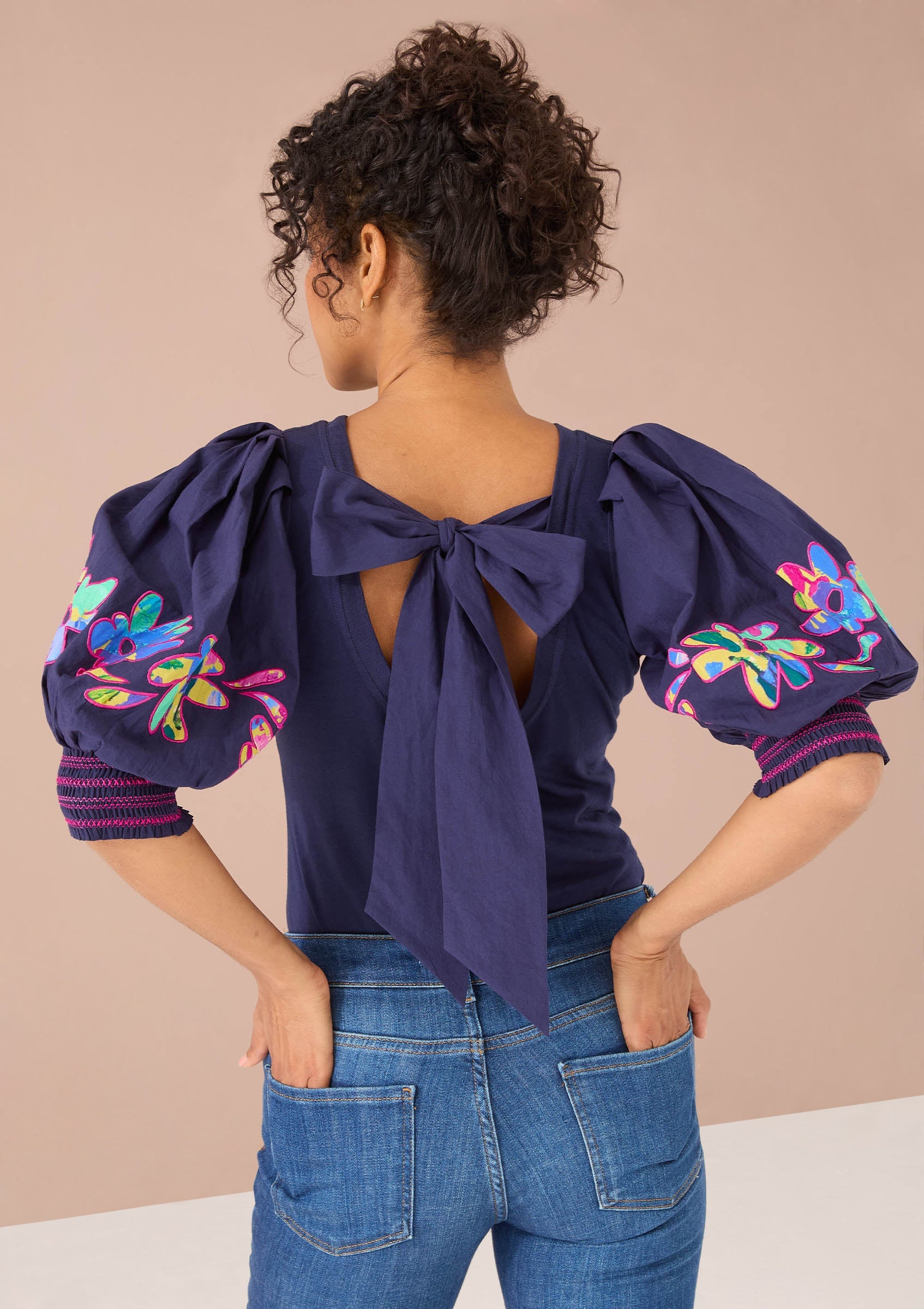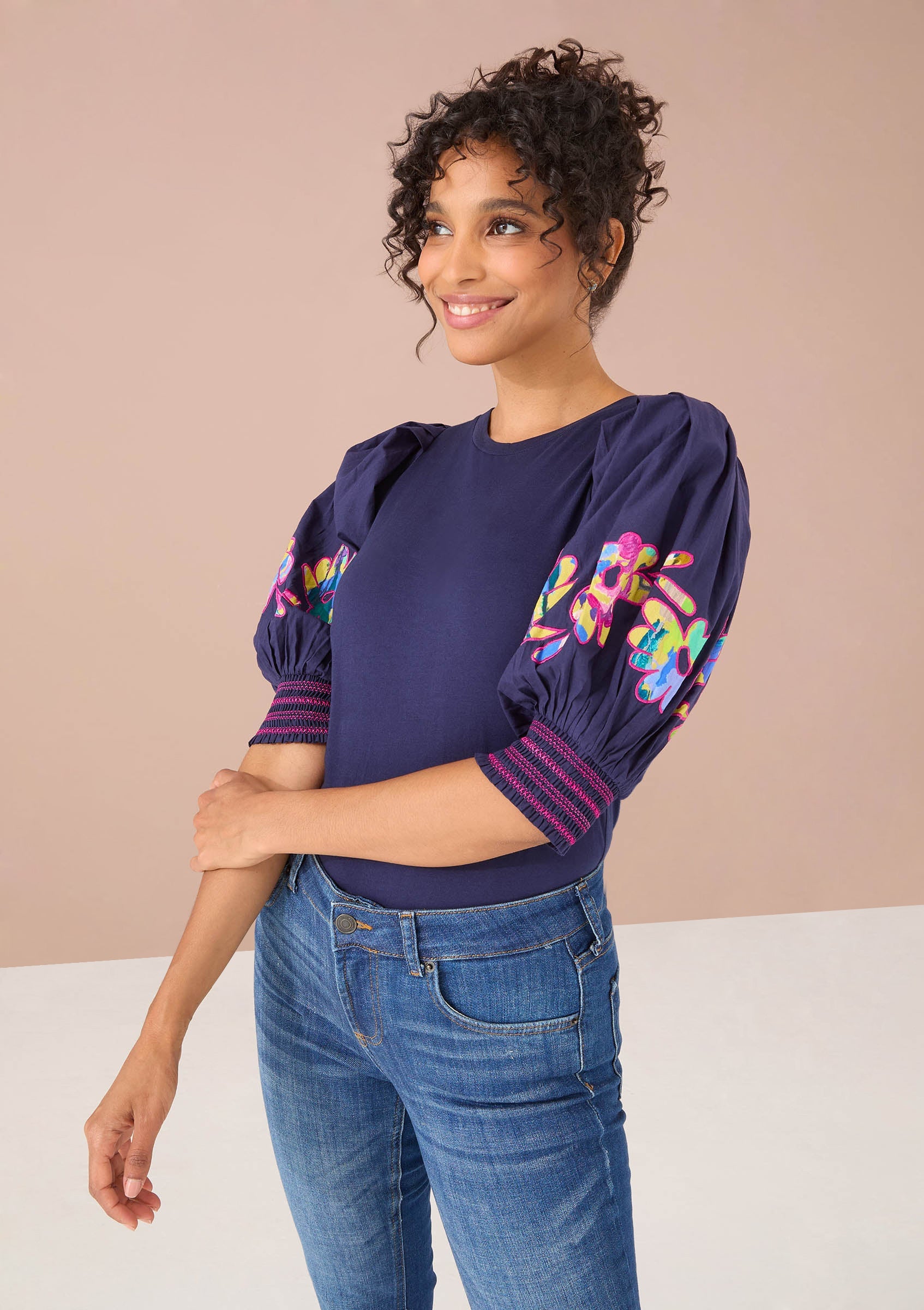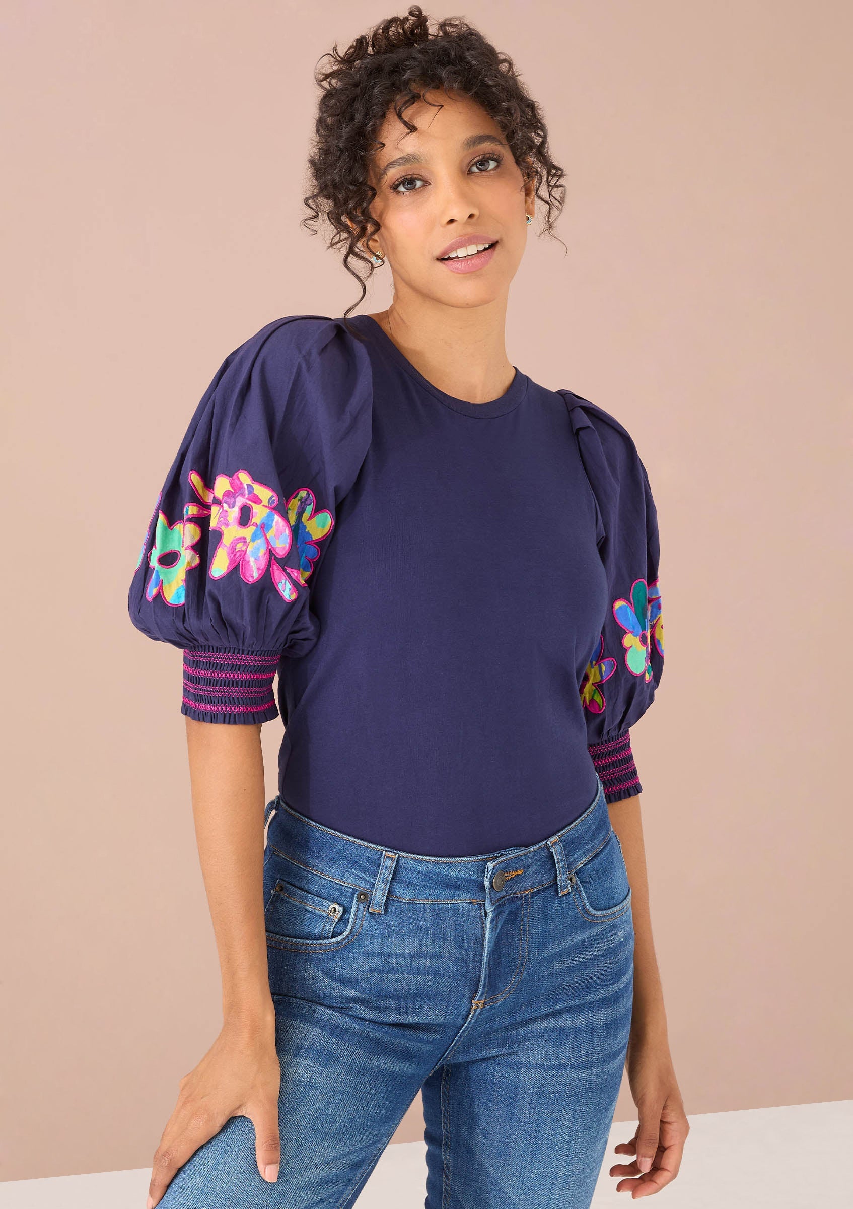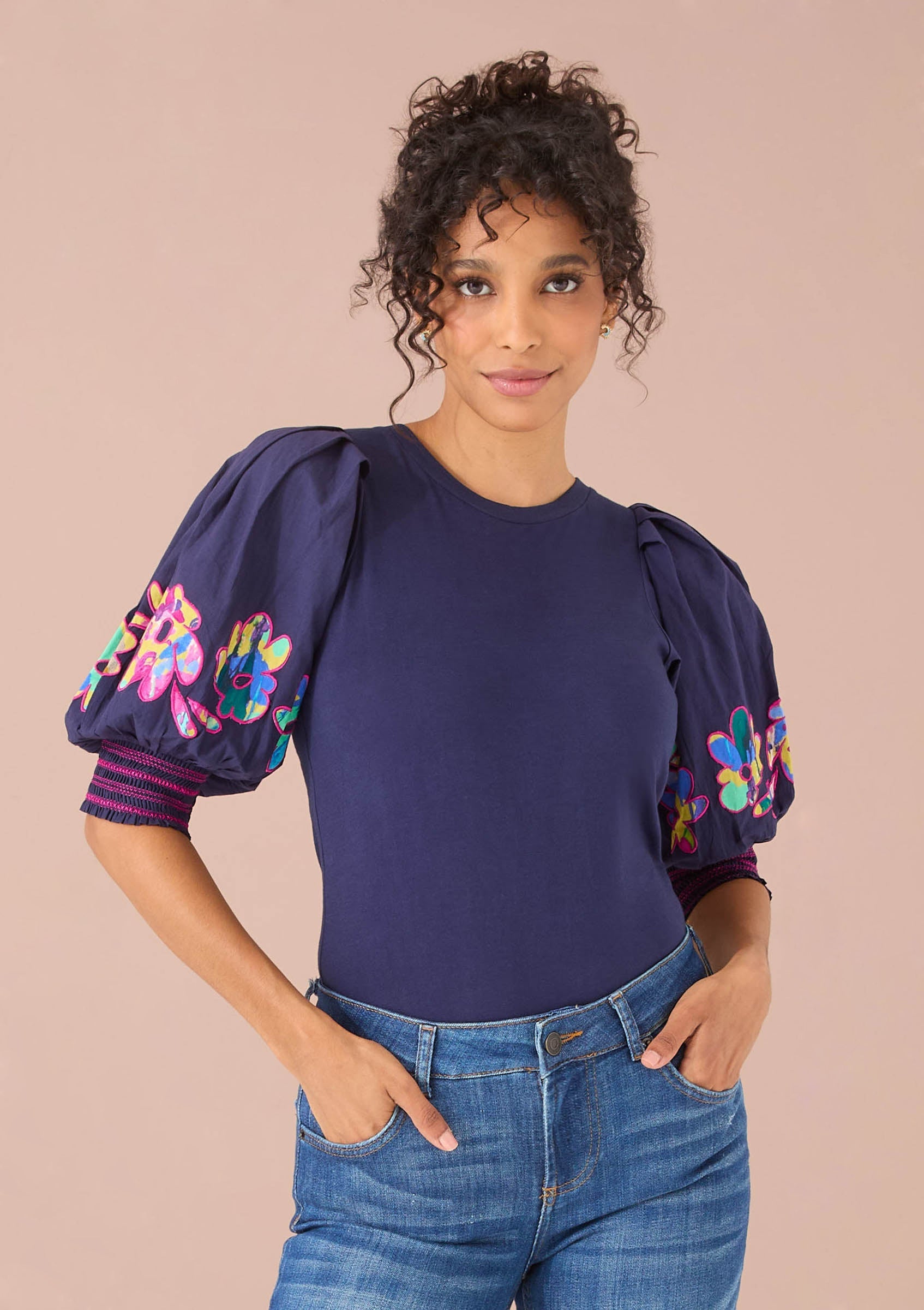 This comfy jersey top features 3/4 cotton poplin puff sleeves with a decorative smocked cuff and vibrant floral applique embroidery. Cotton jersey body makes for an easy and comfortable fit. Detailed with a self-tie in the back and peek-a-boo opening above the bra line.