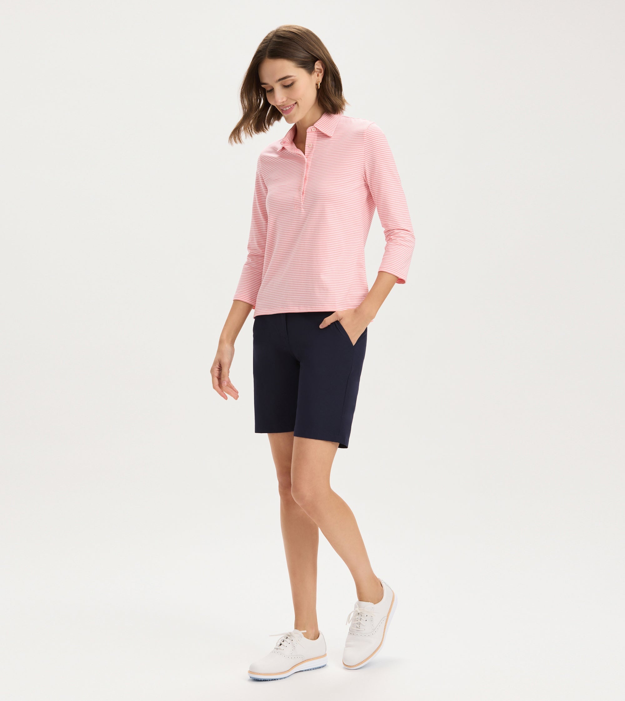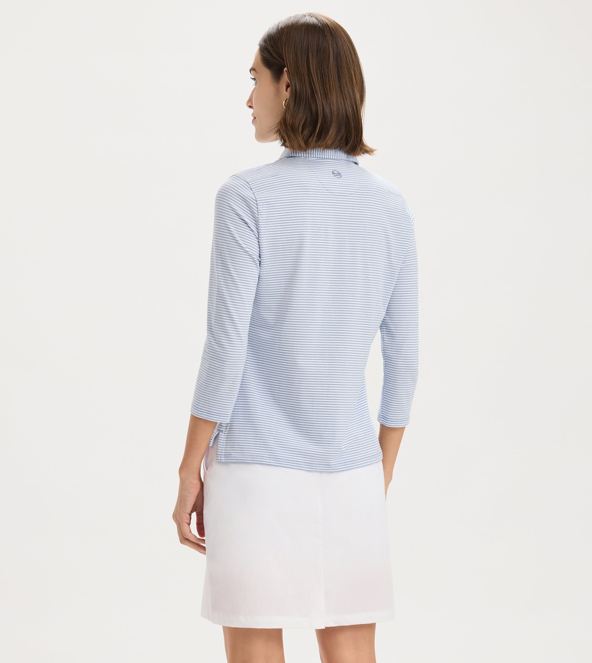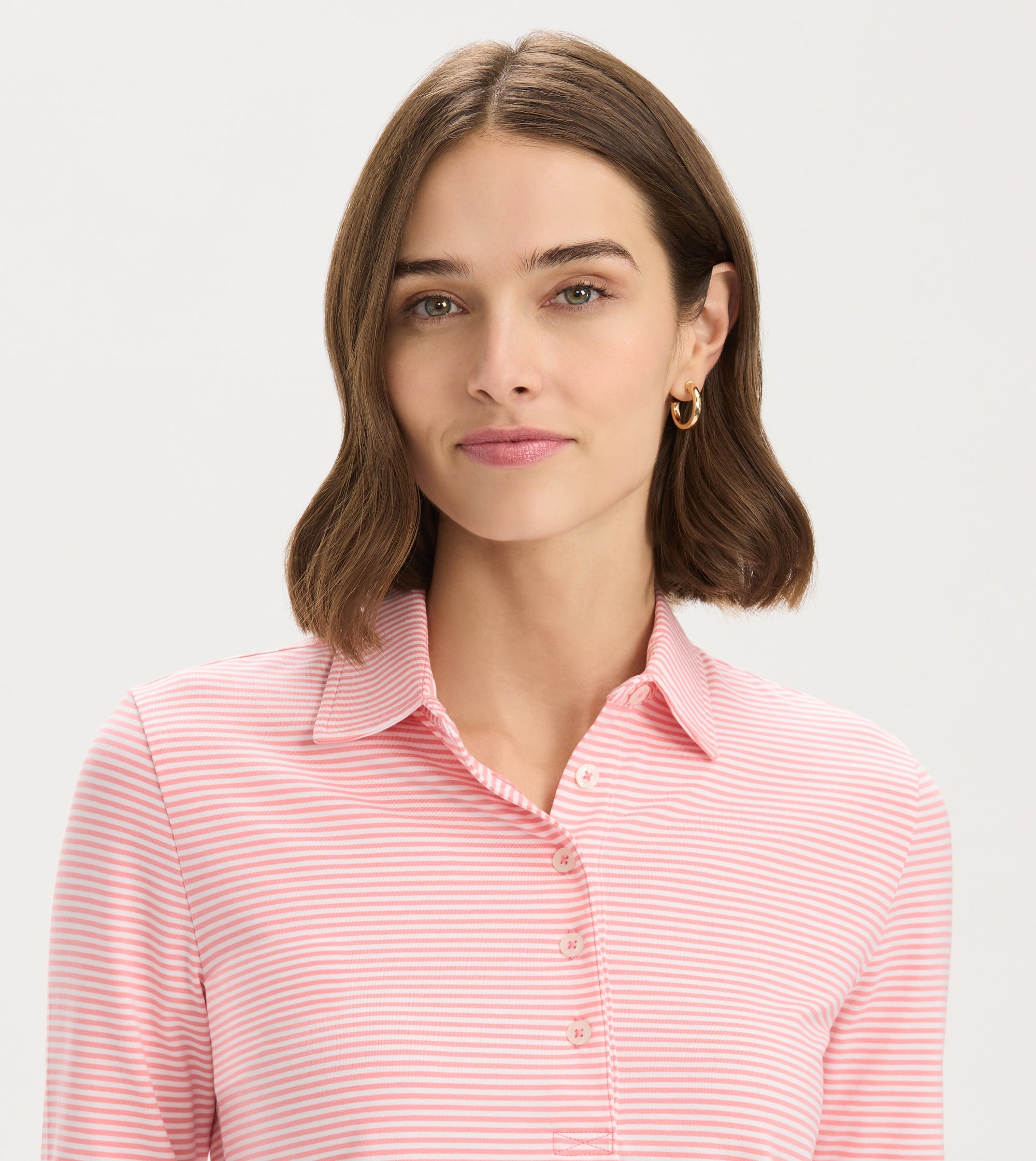 A chic update to the classic, this style will carry you through the off season. Super soft Peruvian Pima cotton. Longer 5 button placket. Shirttail hem. 92% cotton 8% spandex. Machine wash.