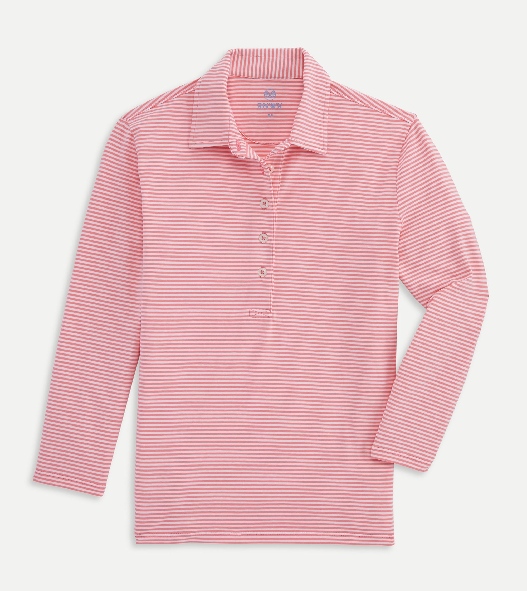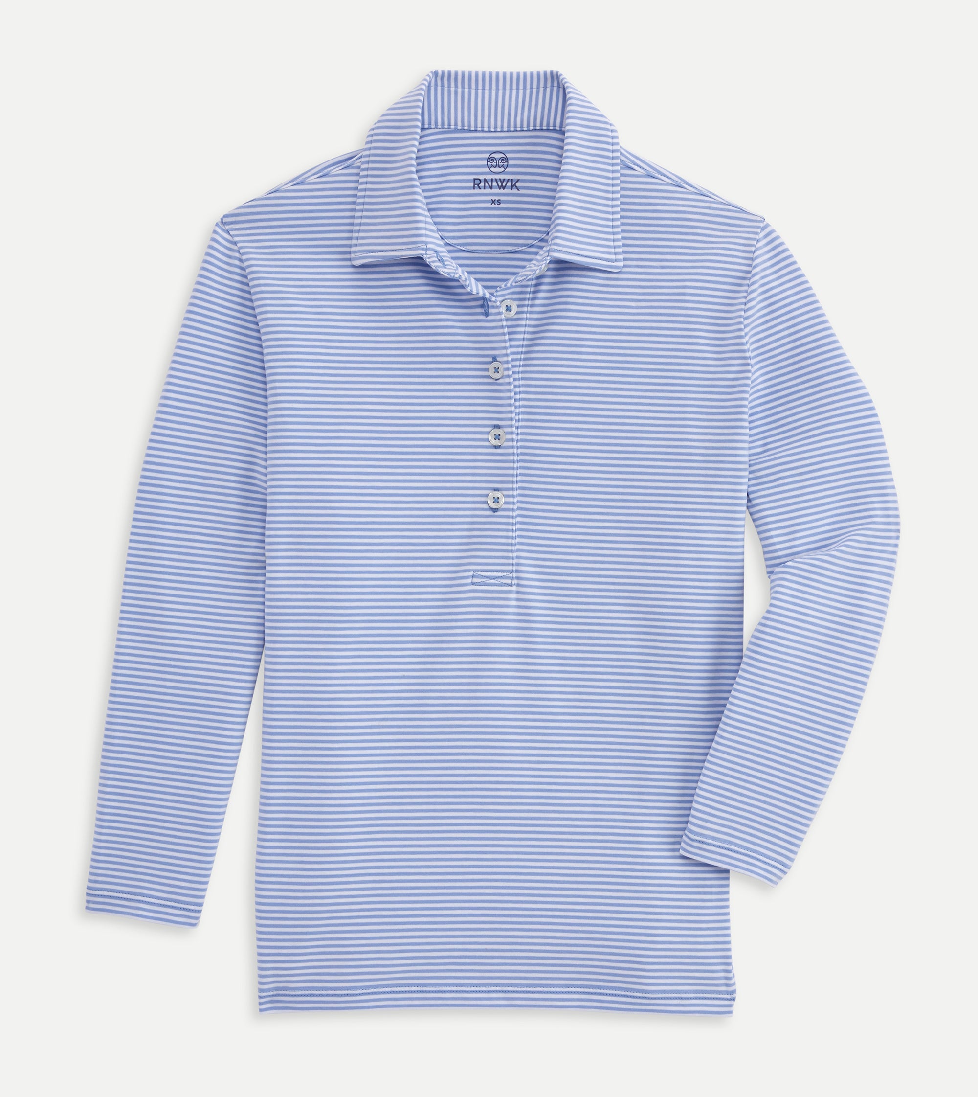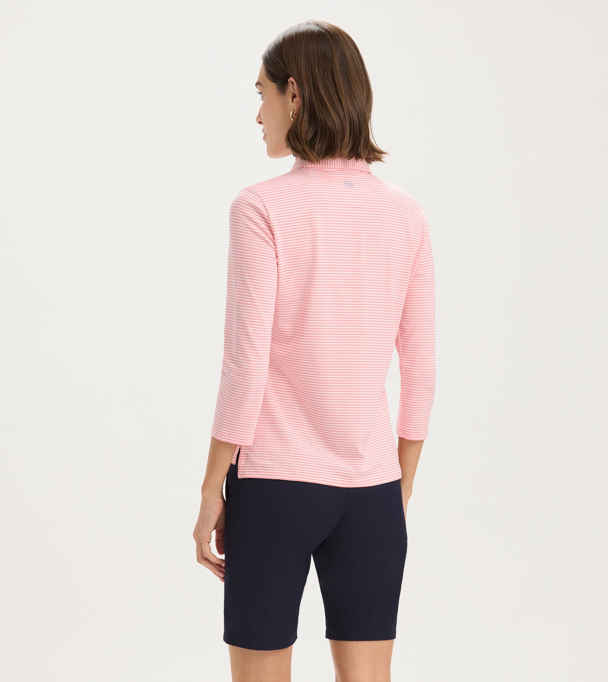 A chic update to the classic, this style will carry you through the off season. Super soft Peruvian Pima cotton. Longer 5 button placket. Shirttail hem. 92% cotton 8% spandex. Machine wash.