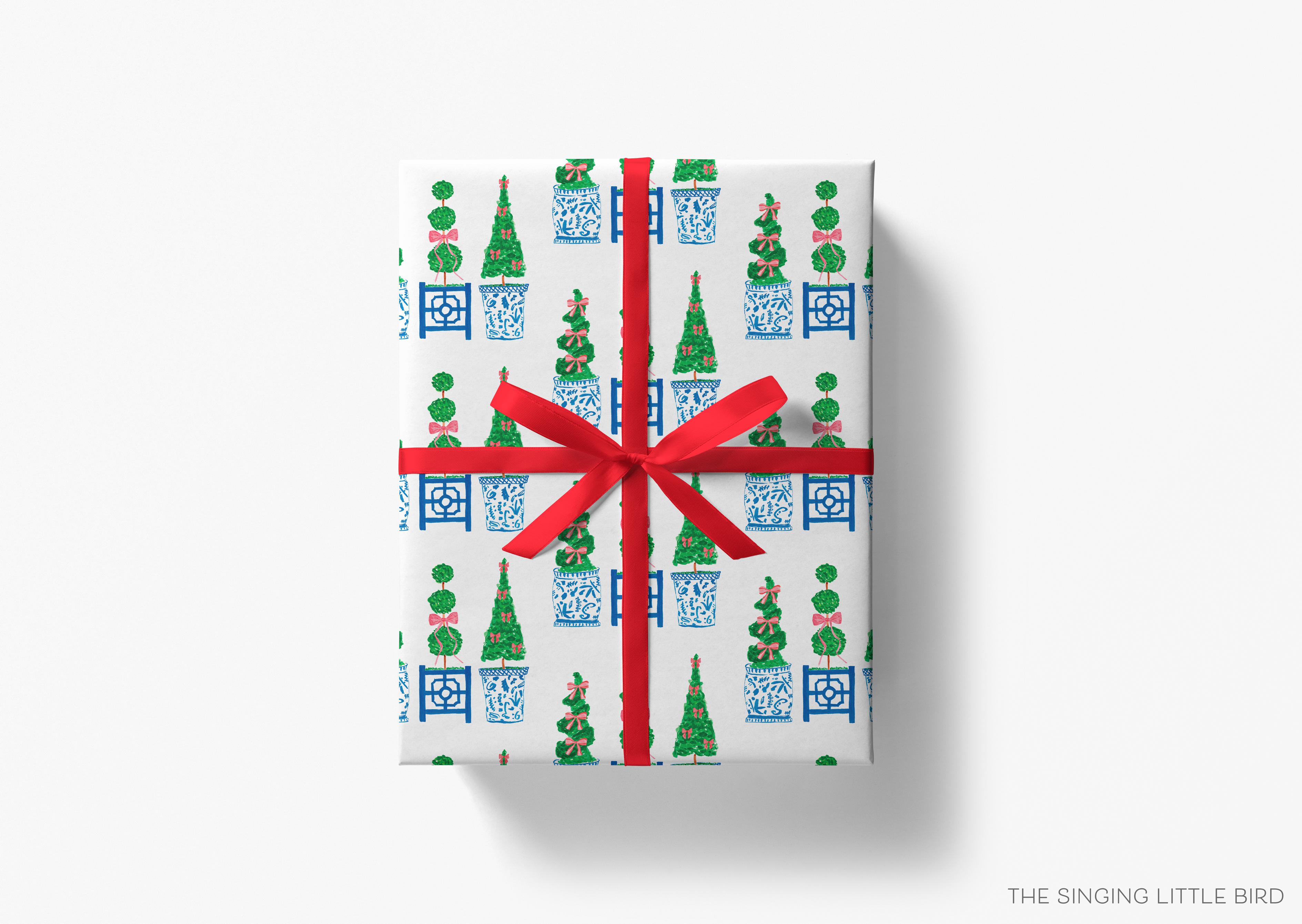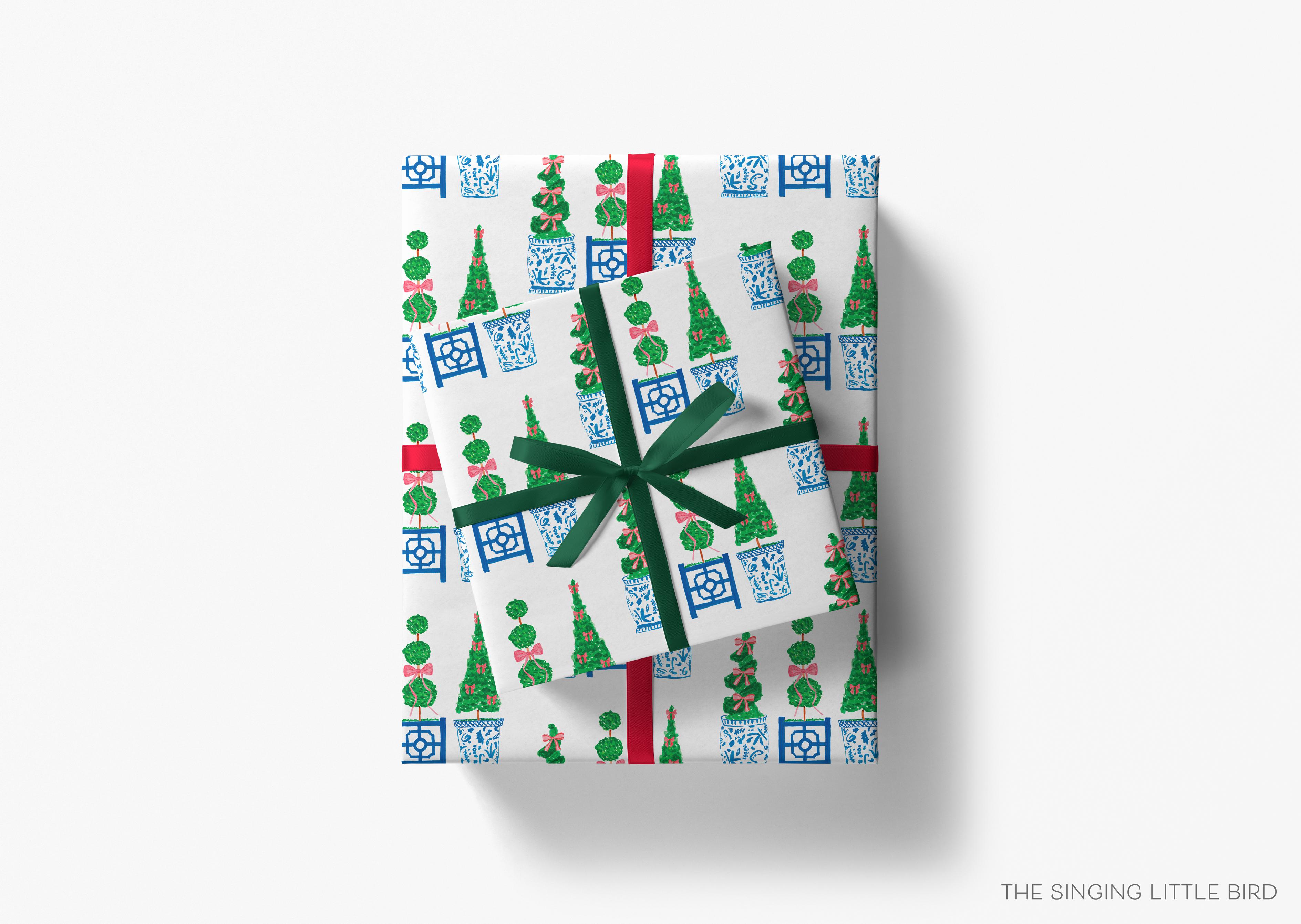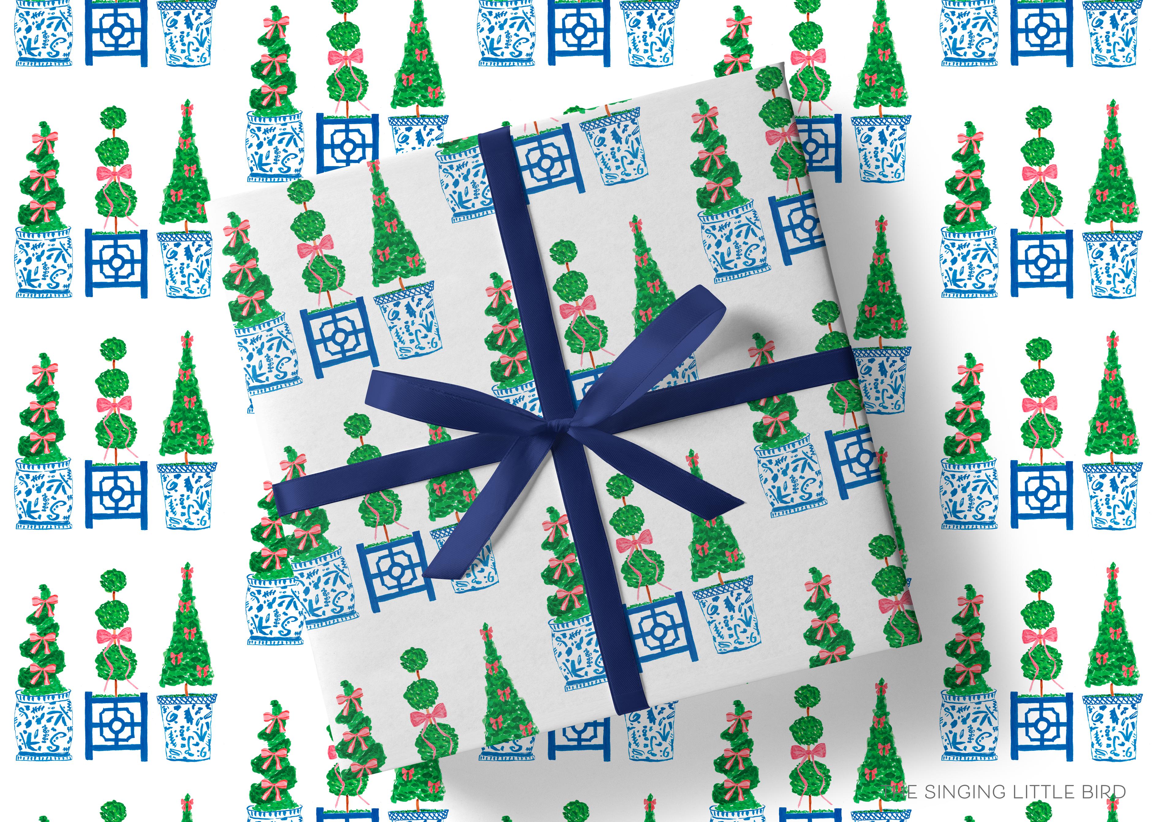 Topiary Christmas Gift Wrap | Chinoiserie Watercolor Christmas Wrapping Paper | Ginger Jar Holiday Wrapping Paper | Blue and White Preppy