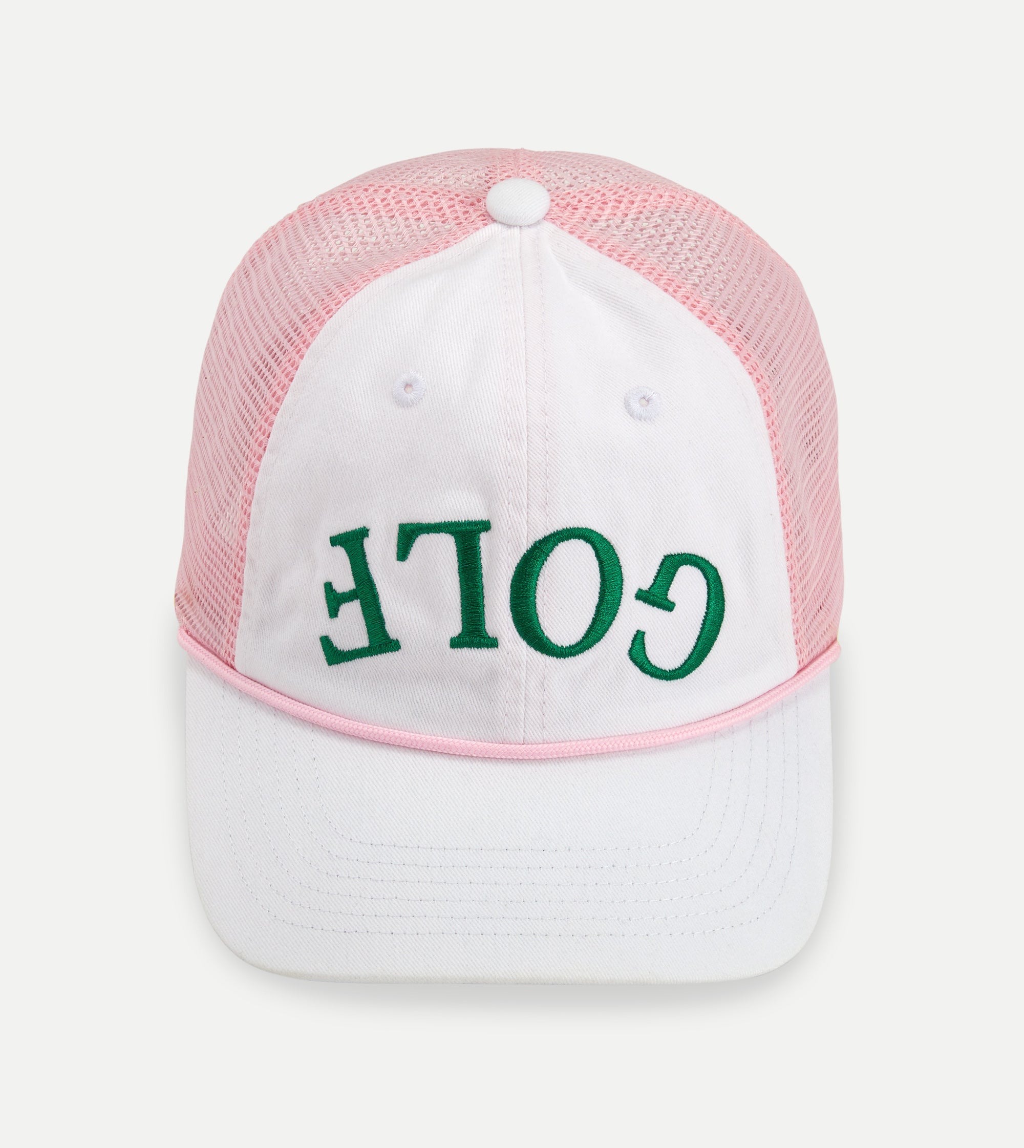 6 panel unstructured cotton twill trucker hat with green rope. Embroidered upside down GOLF on front. One size, adjustable back. Imported.